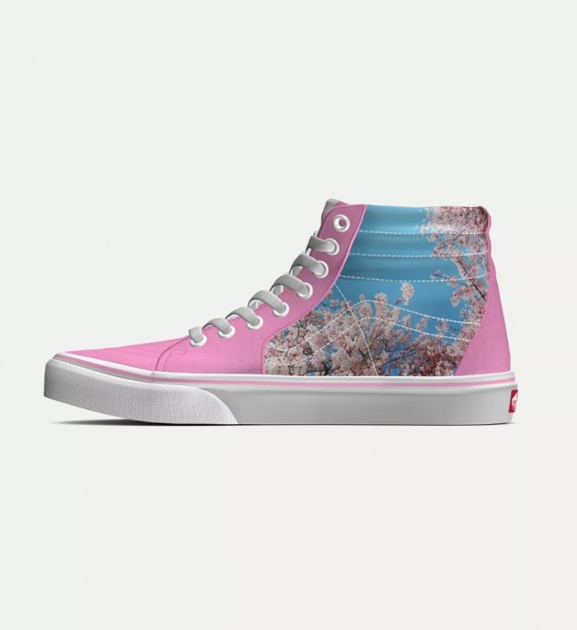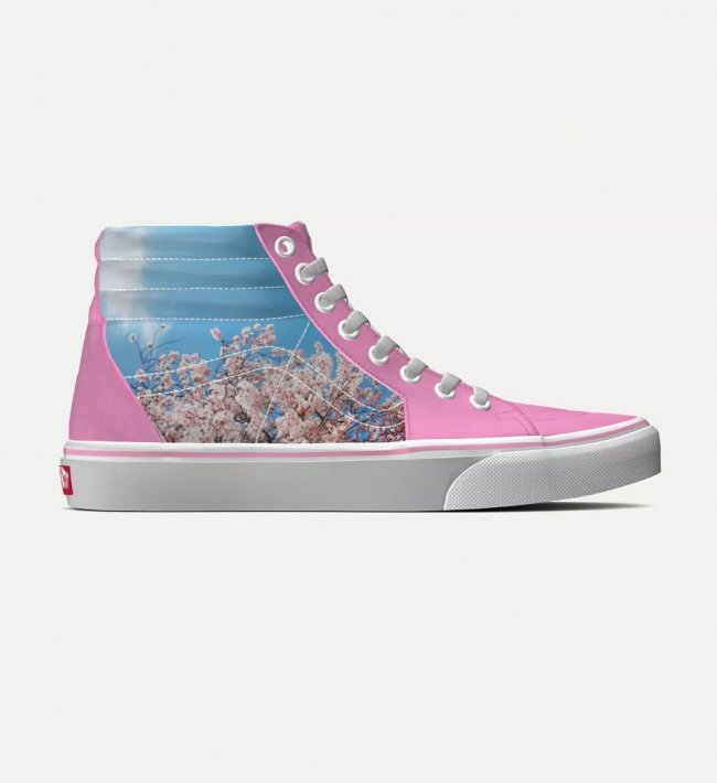 以此打造出一双樱花 Sk8-Hi,这双鞋会把照片印在鞋身两侧,更完整的呈现照片,其他细节使用淡粉色与白色呼应主题,整体有一种甜美清爽的感觉。