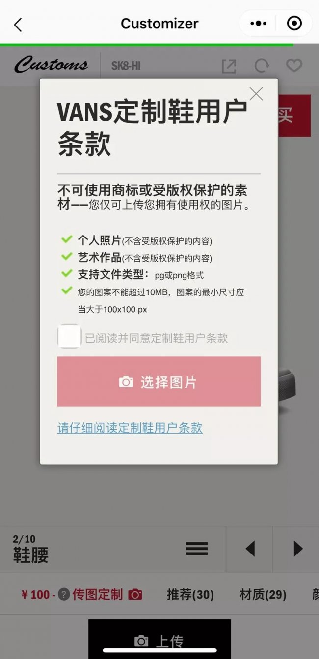 需要注意的是,Vans Customs 自由定制系统对上传的图片会进行审核,照片的内容、格式及大小都有一定的要求。