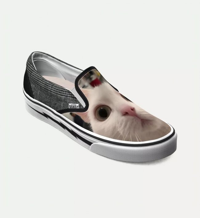 这种风格的定制,照片本身足够吸睛,鞋身上就尽量减少彩色的出现,毕竟这么可爱的猫已经足够引人注目了。