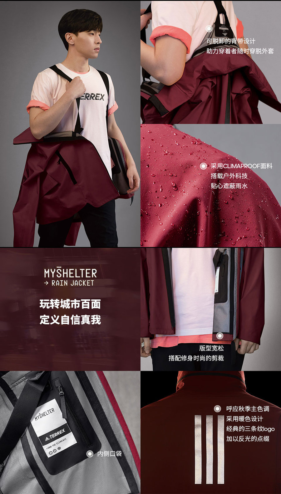 刚刚上架的 adidasTERREX MYSHELTER 融合了专业户外科技和潮流气质,简约又不繁复,带来利落大方的穿着效果,同时拥有毫不打折的户外性能,让你轻松应对全天候天气。