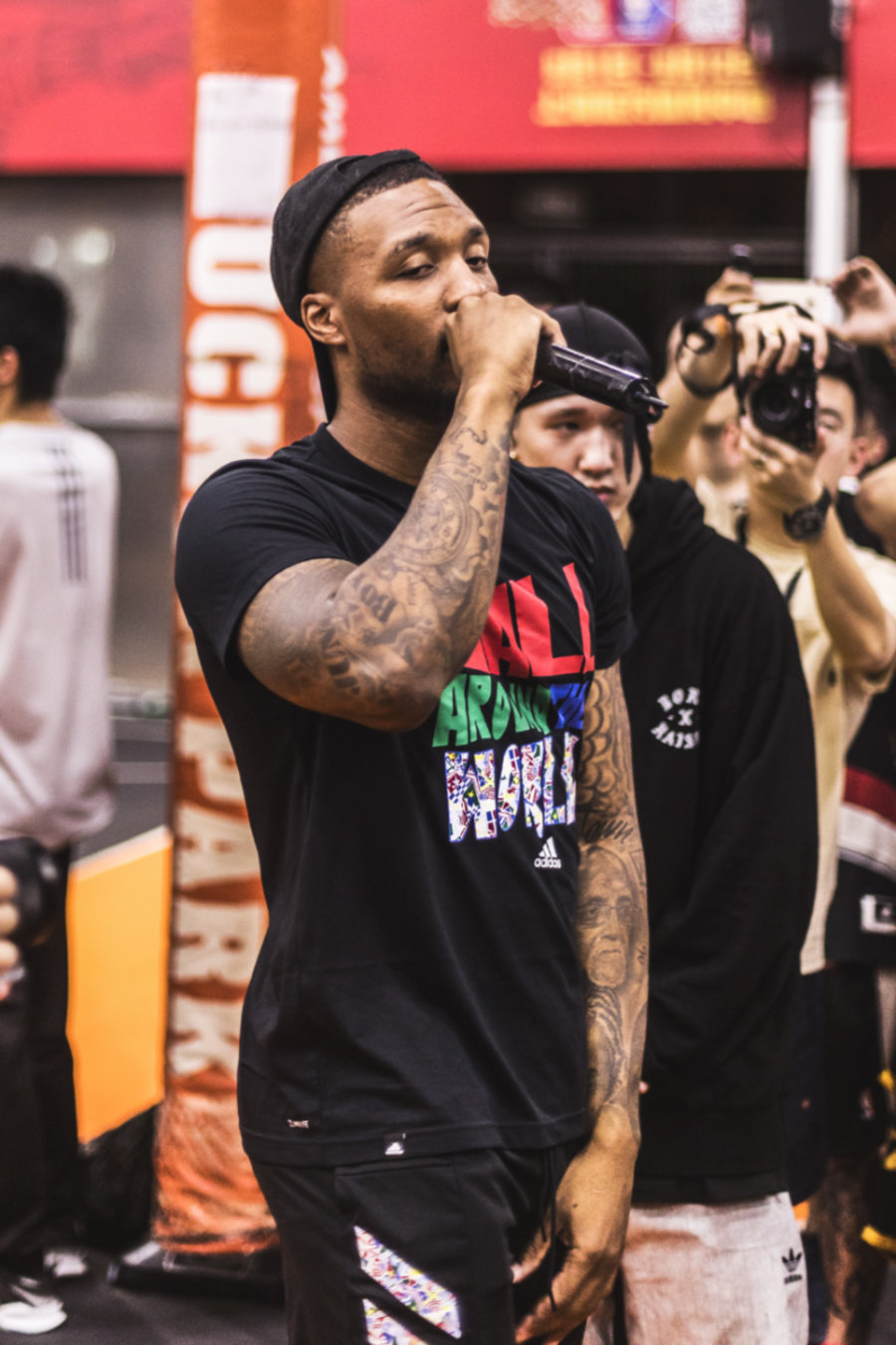 利拉德玩的相当开心,在作为 MC 主持两队 Rapper 的 Battle 之后,亲自下场献艺,一口气带来三首歌。