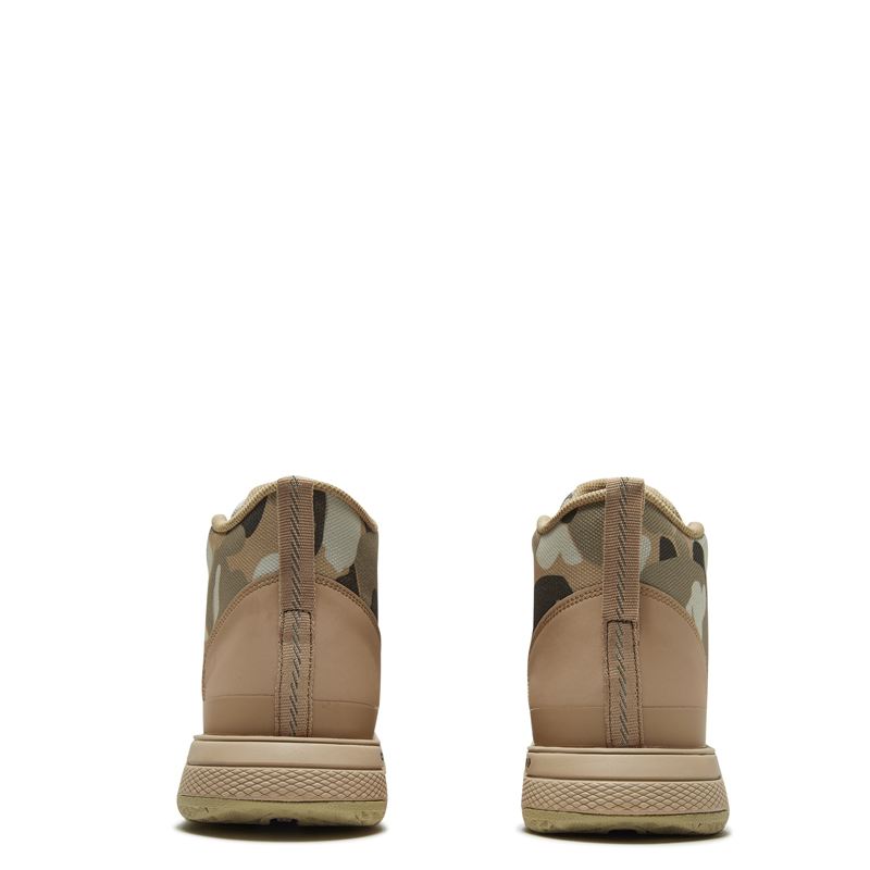 目前推出沙色和黑色两款配色,鞋面均有迷彩装扮,让鞋款看起来更加硬朗,造型酷似军靴。