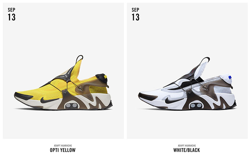 目前首发两款配色 Nike Adapt Huarache 预告已经释出,确定将于 9 月 13 日本周五(早 9 点)于国内 Nike.com 官网正式发售,定价均为 ¥2799 RMB,想要原价入手的小伙伴,不妨多加关注!