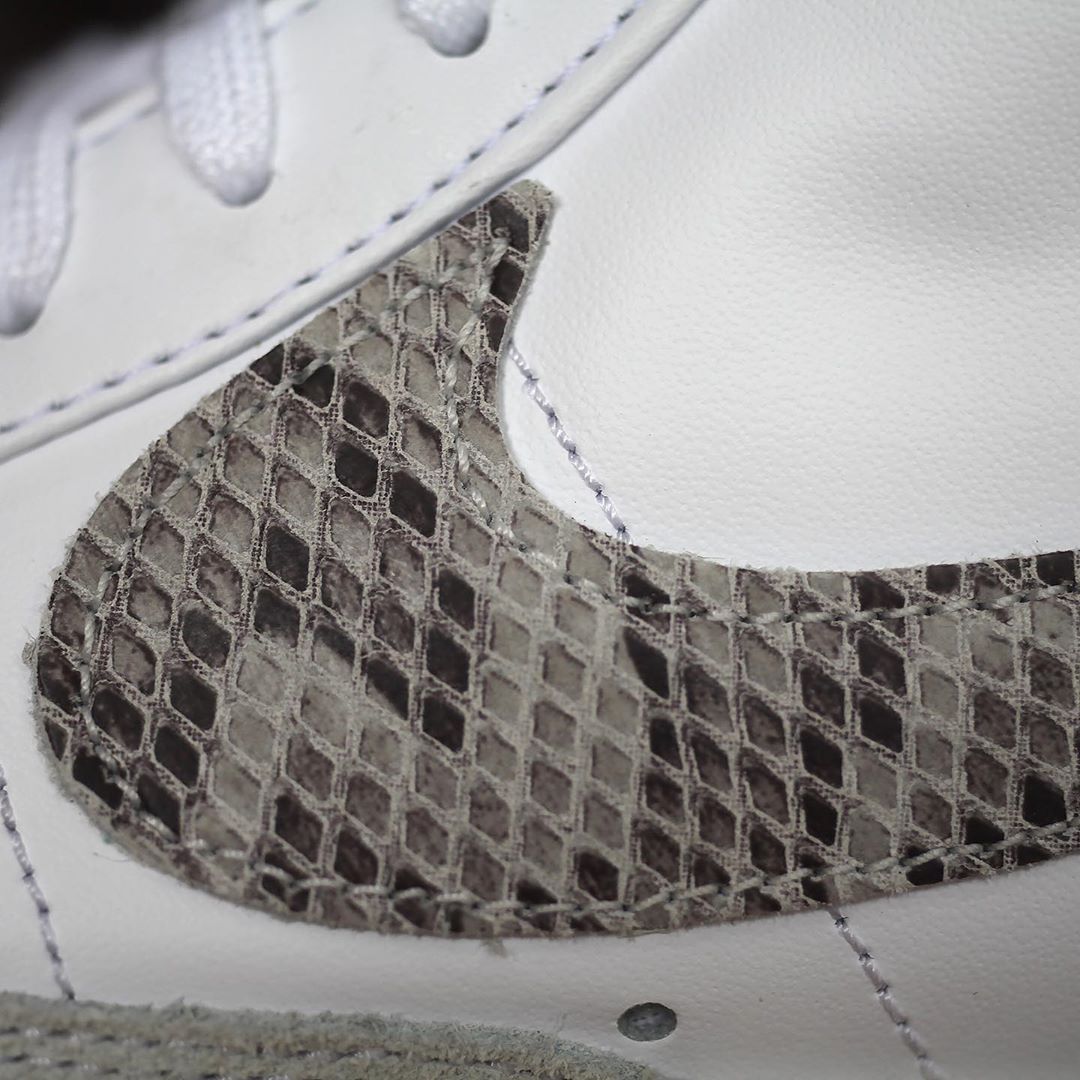 这双鞋以简洁的白色皮革,搭配蛇纹 Swoosh Logo 与后鞋帮装饰,整体设计带有浓郁的复古流行气质。