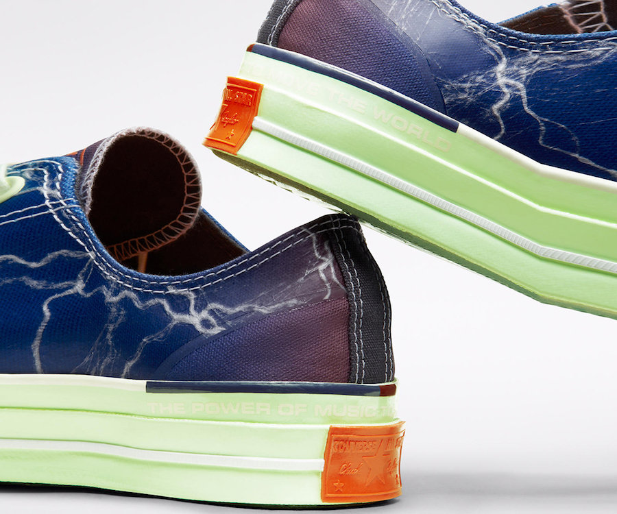 两双 Chuck 70 风格迥异,一双在渐变色鞋面上加入类似闪电图案,搭配浅绿色中底。