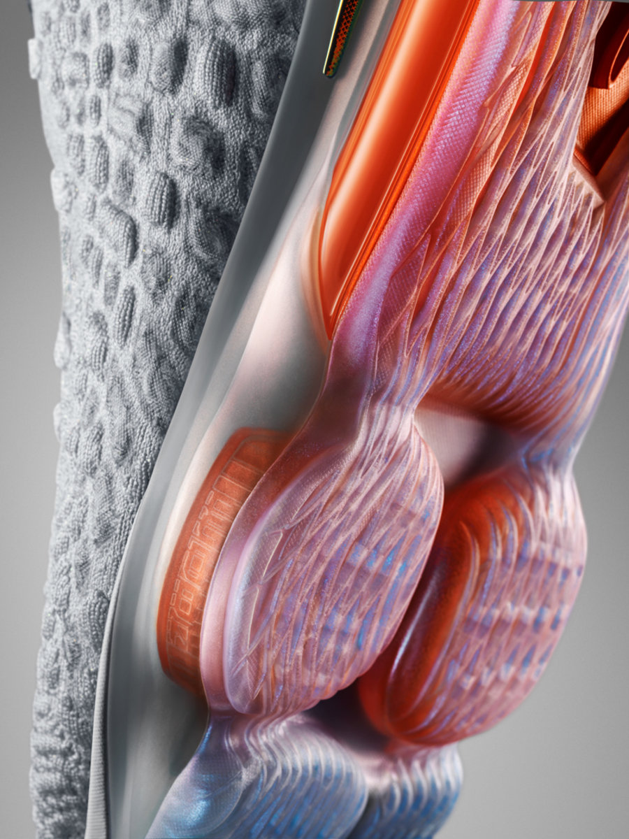 鞋面则搭载了全新 Knitposite 科技,将 Flyknit 编织结构与热熔式织线相结合,在高温处理下,形成外骨骼装甲结构,兼具耐久度,支撑性,且抗拉伸,同时拥有丰富的形状和色彩。