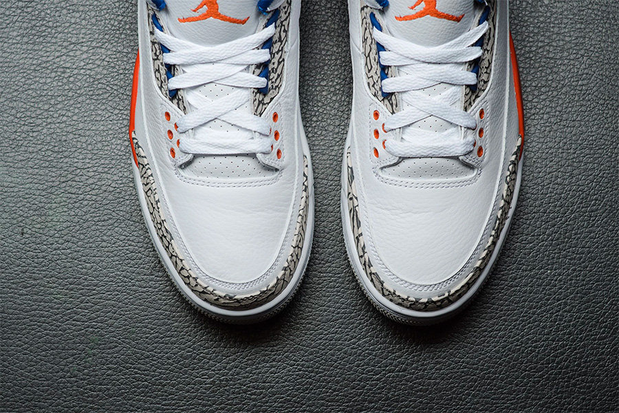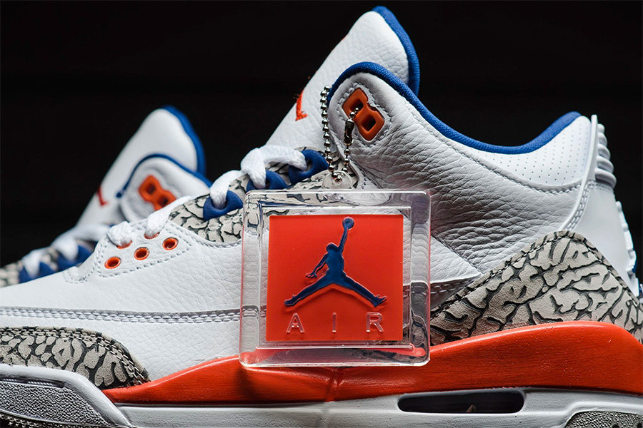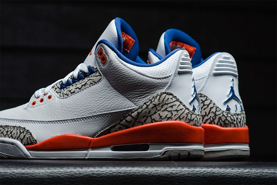 Air Jordan 3 “Knicks” 既有三代最具辨识度的黑灰爆裂纹,又以尼克斯标志性的蓝橙细节装饰,醒目又时尚,秋冬穿搭刚刚好!