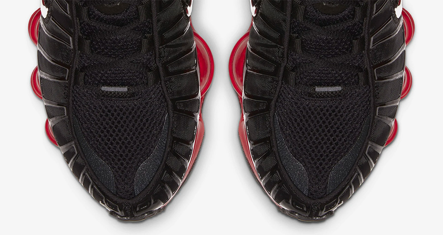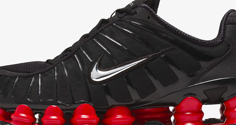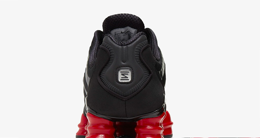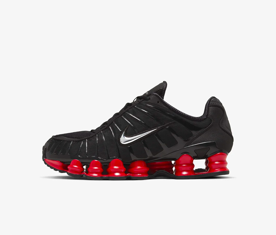 Skepta x Nike SHOX TL 则是低调又经典的黑红装扮,红色的气柱鞋底托衬黑色鞋身,银色 Swoosh 装饰,展现了这位传奇说唱歌手的不羁个性和独特品味。