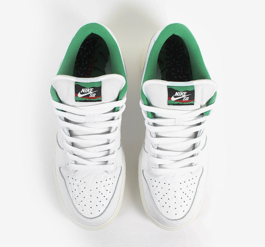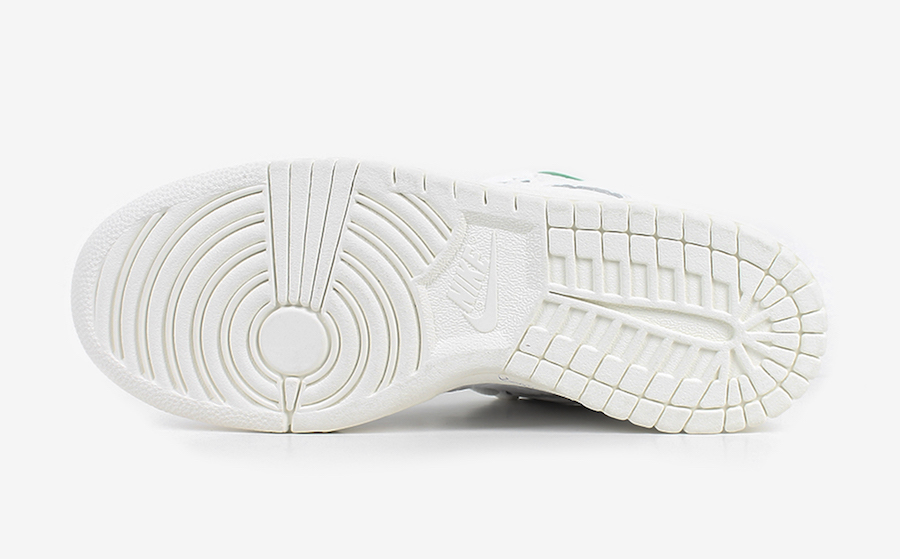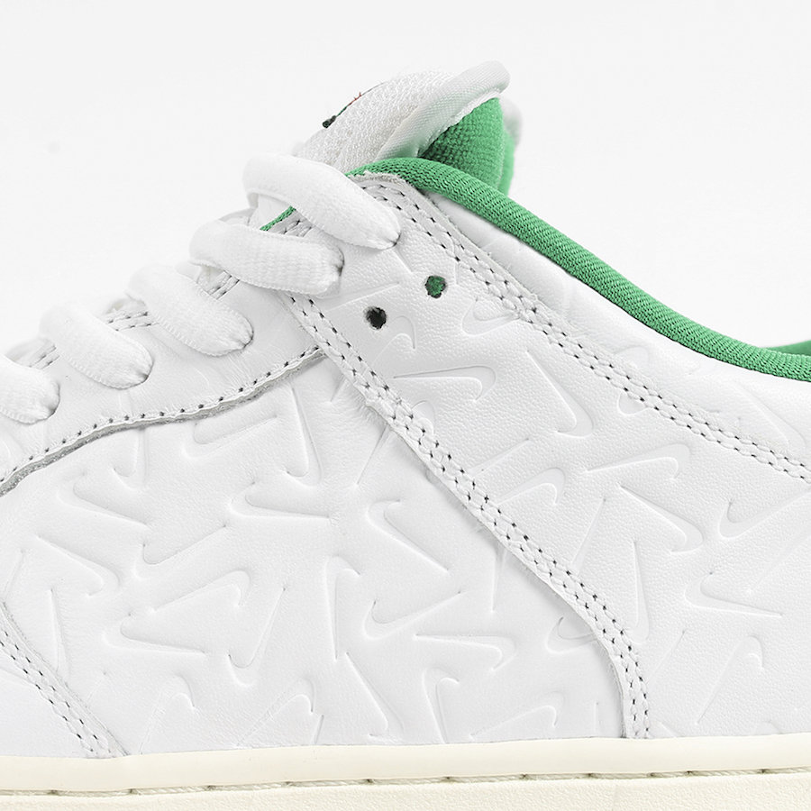 鞋身由白色皮革搭配绿色内衬和发黄的鞋底,整体风格颇为复古。