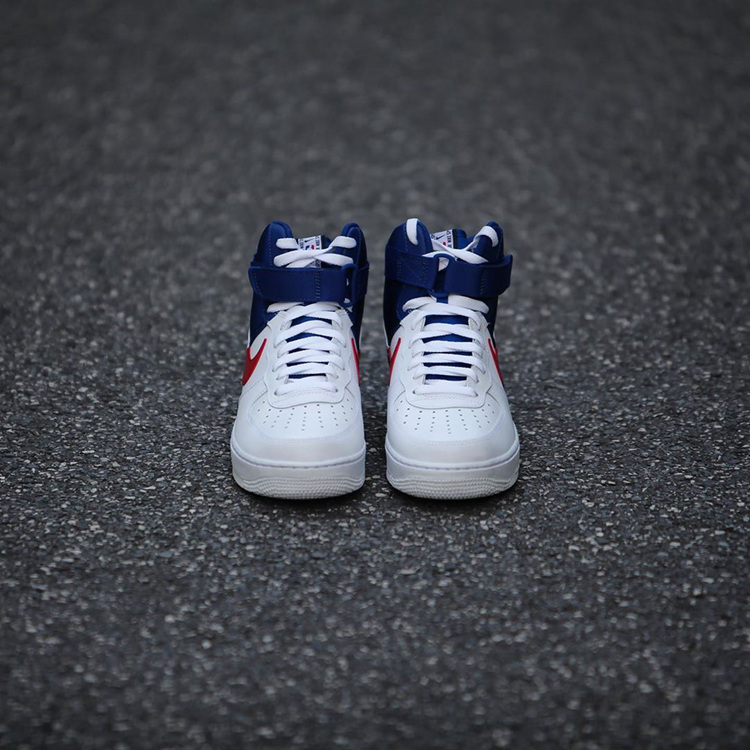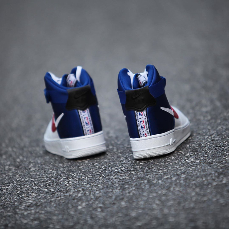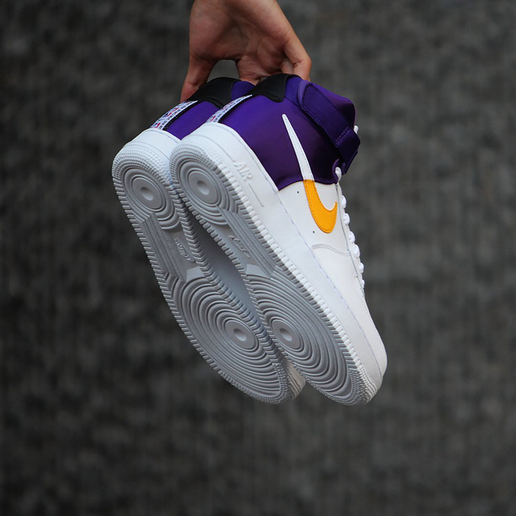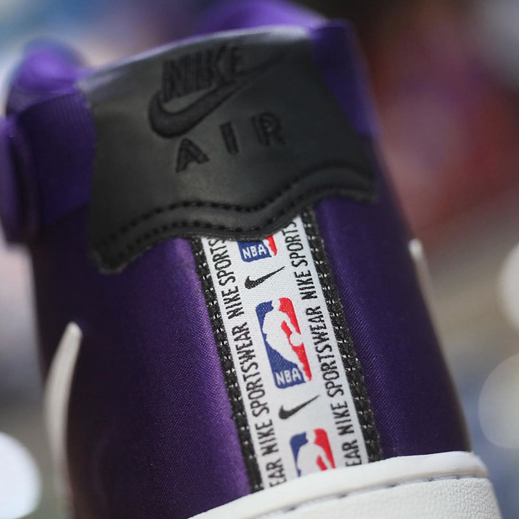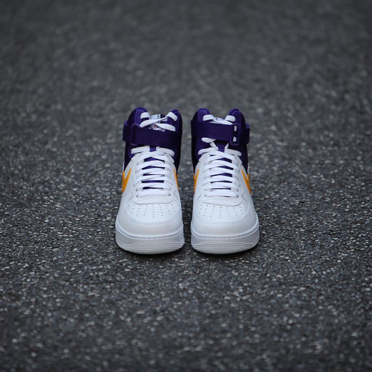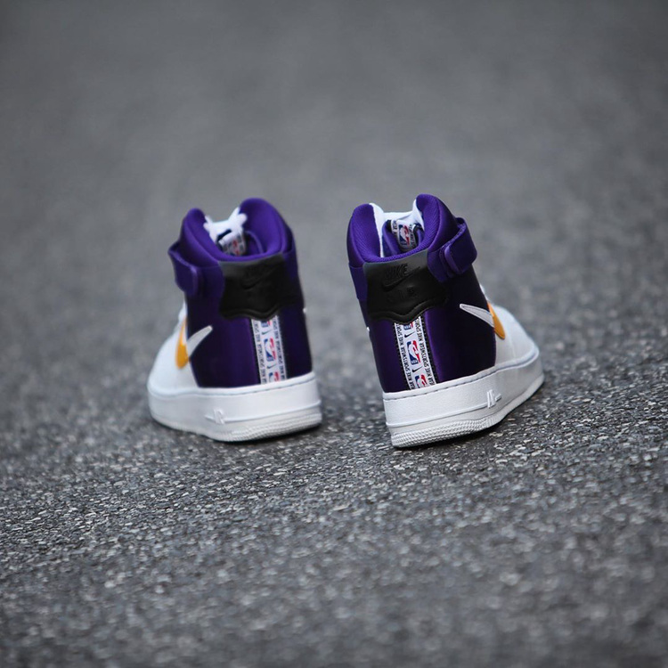两款高帮 Air Force 1 Hi 分别以快船队蓝红配色以及湖人紫金配色呈现,独特阴阳配色设计,侧身 Swoosh 同样采取双色设计,十分亮眼。