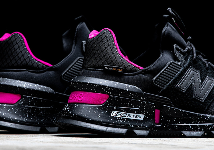以 997S 为设计蓝本,一袭酷黑示人,同时细节点缀亮眼的粉红色装饰,整双鞋的表现十分惊艳。