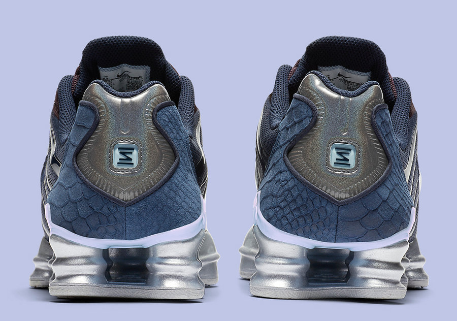 标志性骨架结构的鞋身线条与夸张的网眼组成复杂鞋面,外底由贯穿全掌的 Shox 气柱打造,霸气十足,同时带来十足的科幻感。