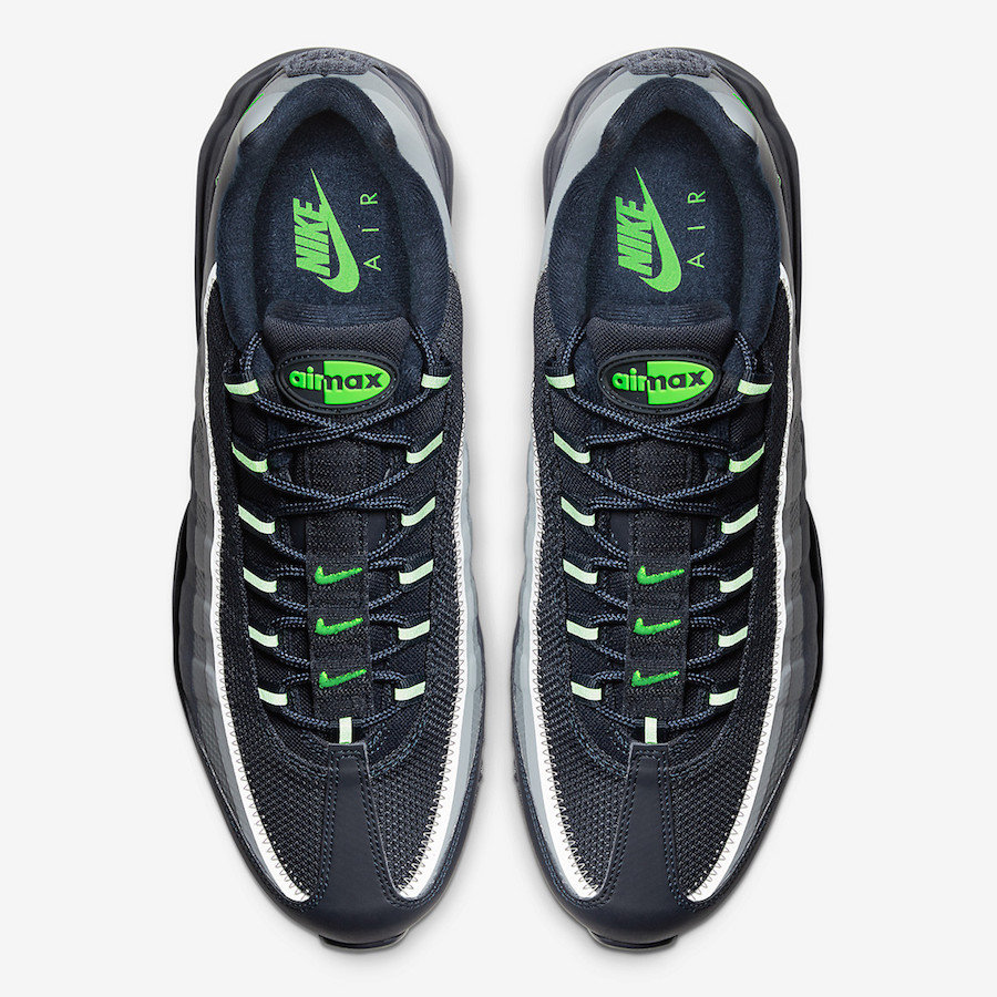整双鞋以深蓝色调呈现,搭配灰色条纹设计,应用在 Air Max 95 标志性的波浪鞋身,呈现出丰富的层次感。