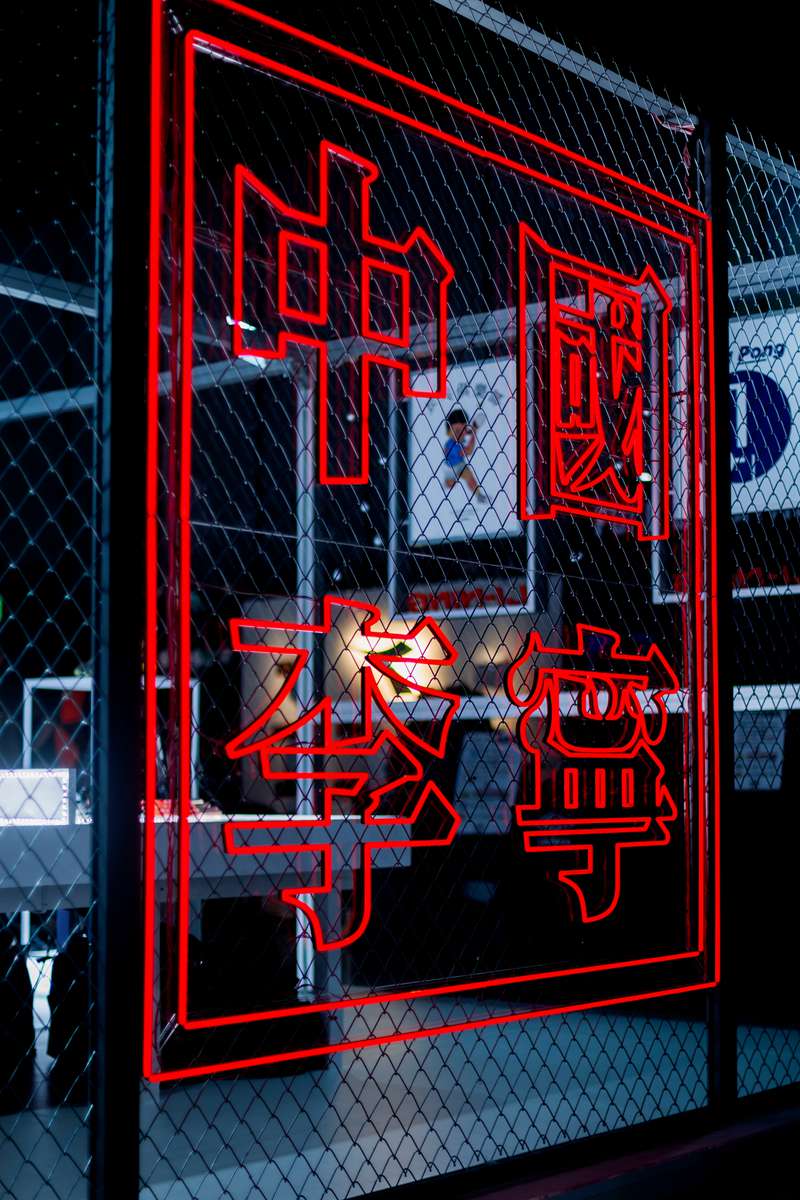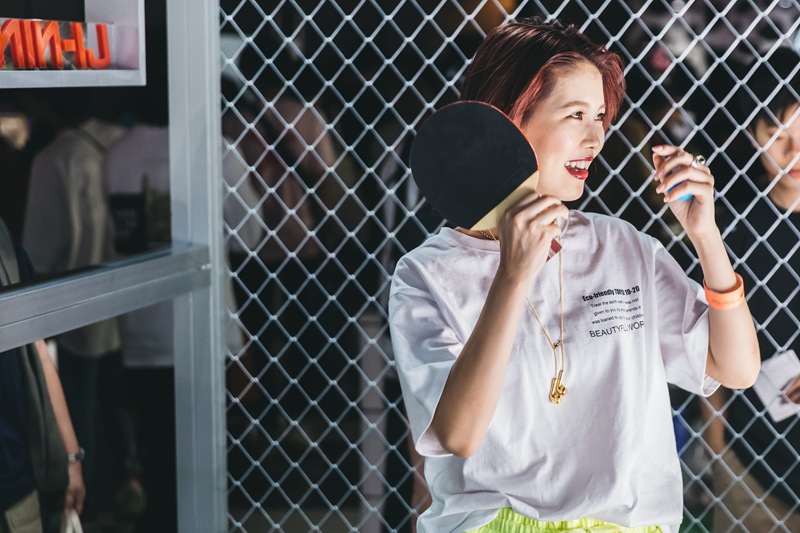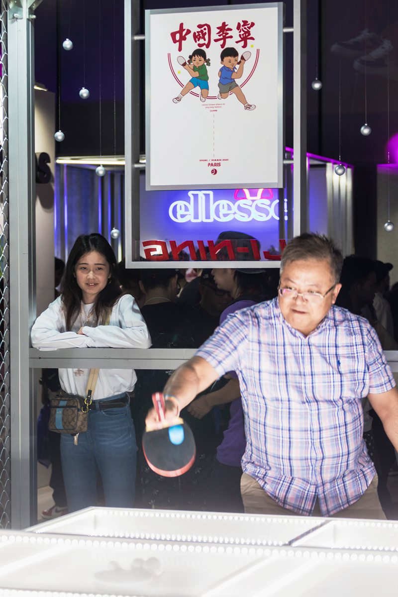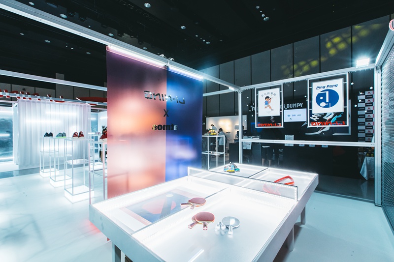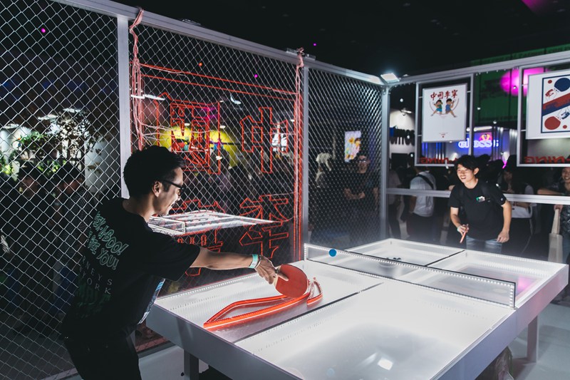本次李宁展台被划分为两个主要区域,除了上面我们近览的新品陈列外,另外半区则放置了一张特别设计的乒乓球台。