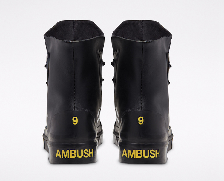后跟位置也以黑色橡胶材质包裹,同时以亮眼黄色 “AMBUSH 9” 字样示人,带来不一样的时尚气质。