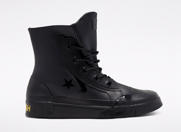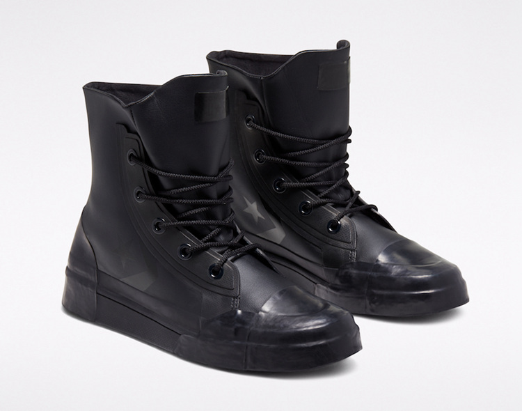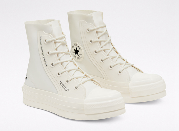此次共带来两款鞋型,早前曝光的乳白色 Chuck 70,灵感来自 Converse 过去为美国军方生产的老式军用冬靴。鞋面采用皮革材质覆盖,搭配夸张的鞋头设计,带来酷似 Rick Owens 的既视感,同时加厚设计的鞋底,也另整双鞋的规格进一步提升。