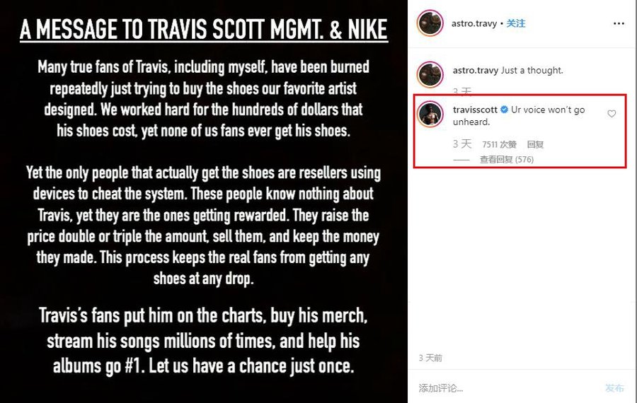 Travis Scott 本人同样关注到了这一事件,当天便在粉丝下方回复留言 “Ur voice won’t go unheard.”(“你的诉求绝不会没人理睬。”)