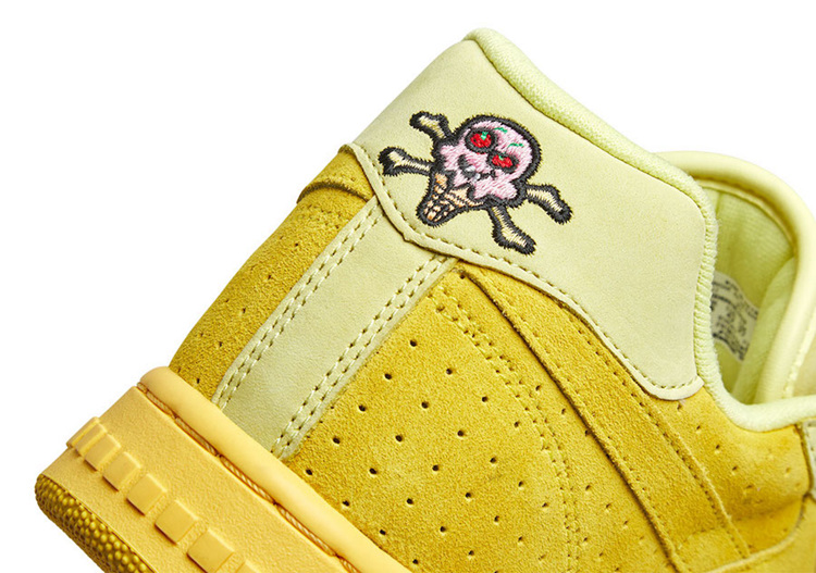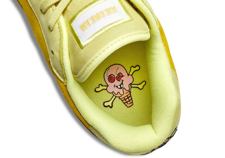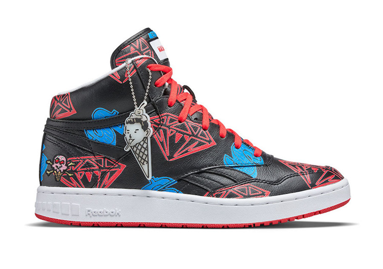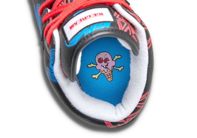 鞋身均以亮眼跳跃的色彩构色,其中 Answer V 鞋型中,粉色、黄色与绿色搭配,整双鞋色彩十分鲜艳,侧身将原有艾弗森的个人 Logo,替换成为冰淇淋骷髅图案,表现十分亮眼。