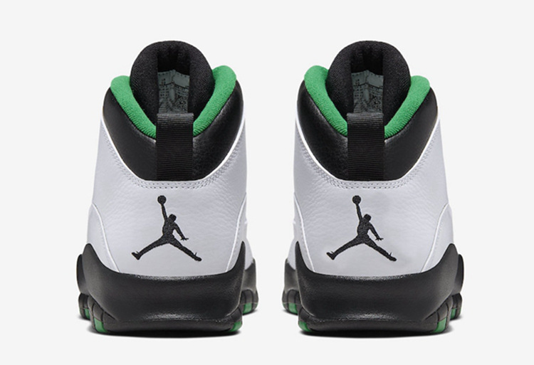 后跟带有黑色刺绣 Jumpman Logo,在白色底色映衬下显得格外醒目,标志性 Air Jordan 10 外底,采用黑色与绿色相间装扮,后掌位置点缀亮眼黄色 Jumpman Logo,完善整双鞋的设计。