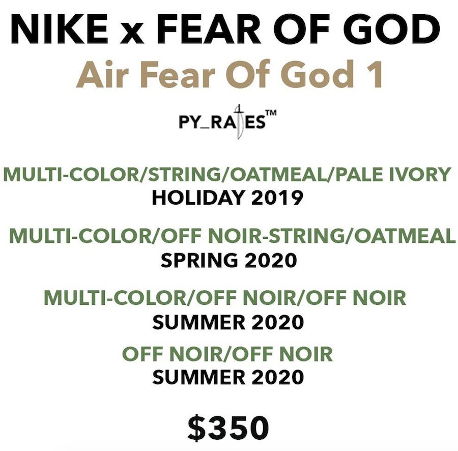 近日由曝料账号 PY_RATES 透露,今年年底、明年春、夏会陆续发售 4 款 Nike Air Fear of God 1 新品。