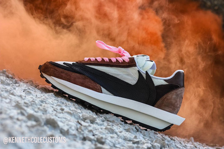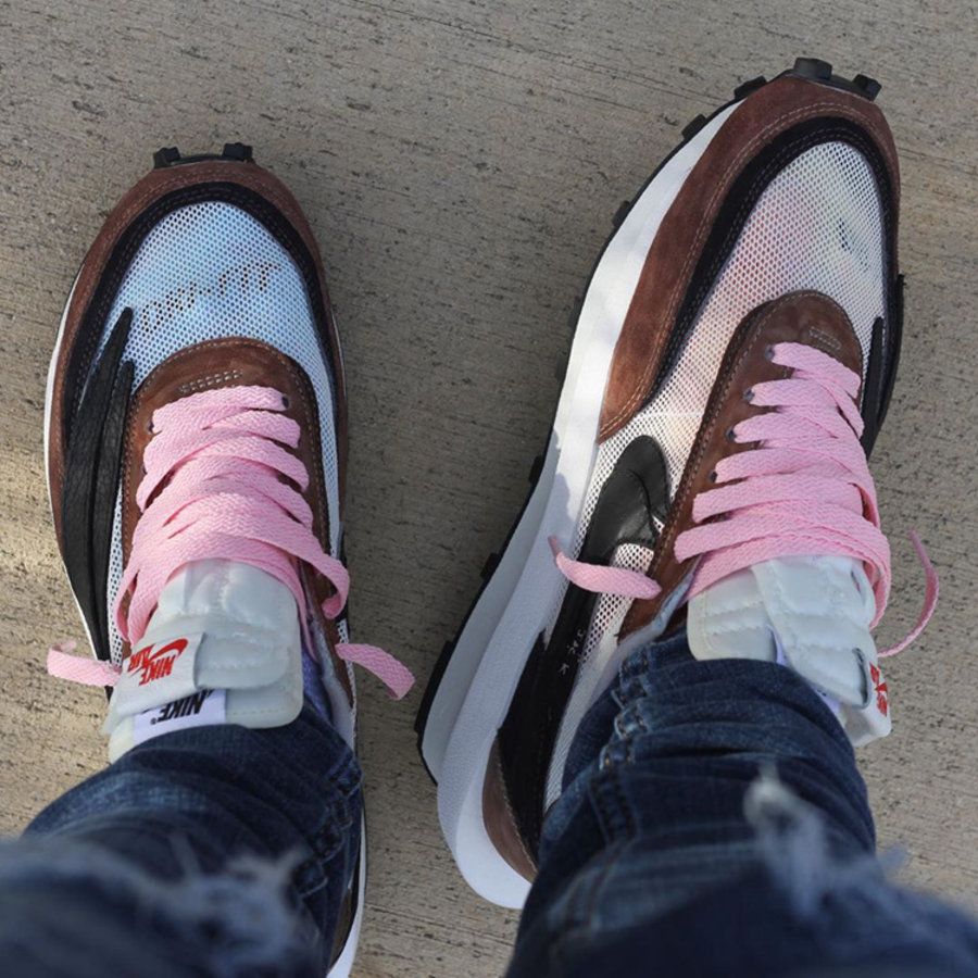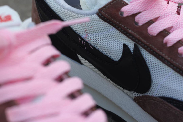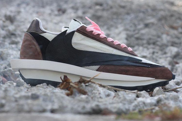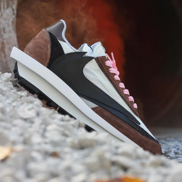 整双鞋以 Sacai x Nike LD Waffle 鞋型为设计蓝本,鞋面色彩选用「反钩」AJ1 的黑色、白色与棕色。纱网鞋面与细腻麂皮材质,细节辅以皮革材质点缀,丰富的用料构成鞋面独特的层次感。