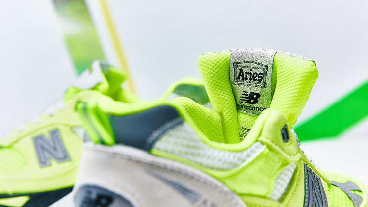 其中一款以荧光绿色为主调,细腻的麂皮材质与网眼拼接构成鞋面,带来丰富的层次感,跳跃的色彩令原本复古的造型演绎出十足的活力。后跟、鞋舌与鞋垫点缀 Aries 品牌标志,彰显联名身份。