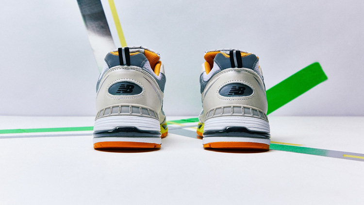 另一款鞋面以白色为底色,深灰色细节穿插在侧身等部位,最大亮点在于前掌中底与内衬采用荧光橙色装扮,与荧光绿色款形成十分和谐的组合,鞋身同样多处联名细节点缀。