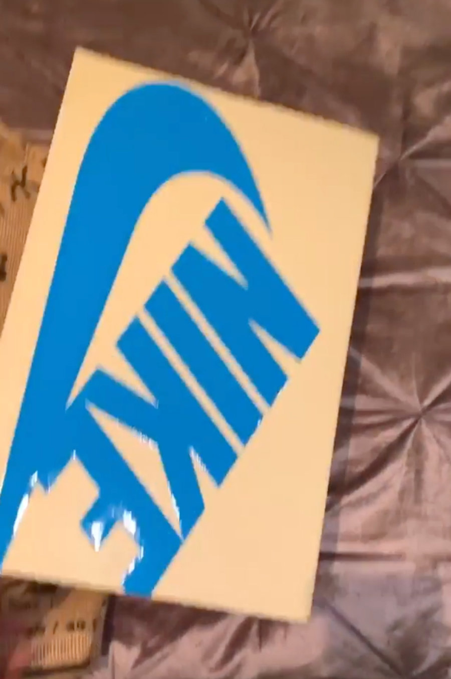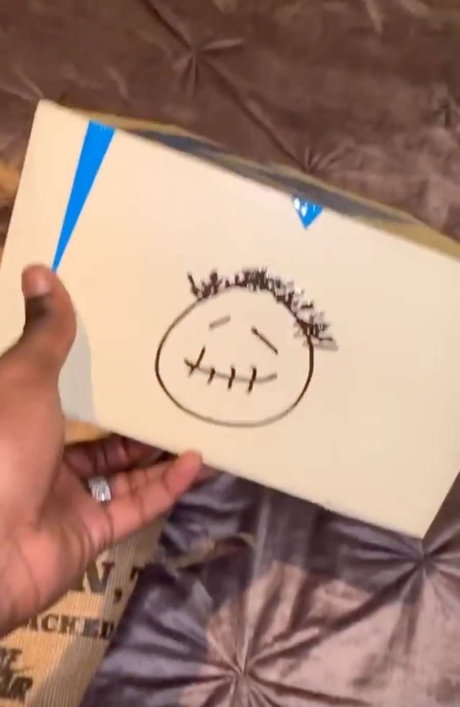 鞋盒采用白蓝色的抽屉鞋盒,上面印有 Travis Scott 标志性的鬼脸 Logo。