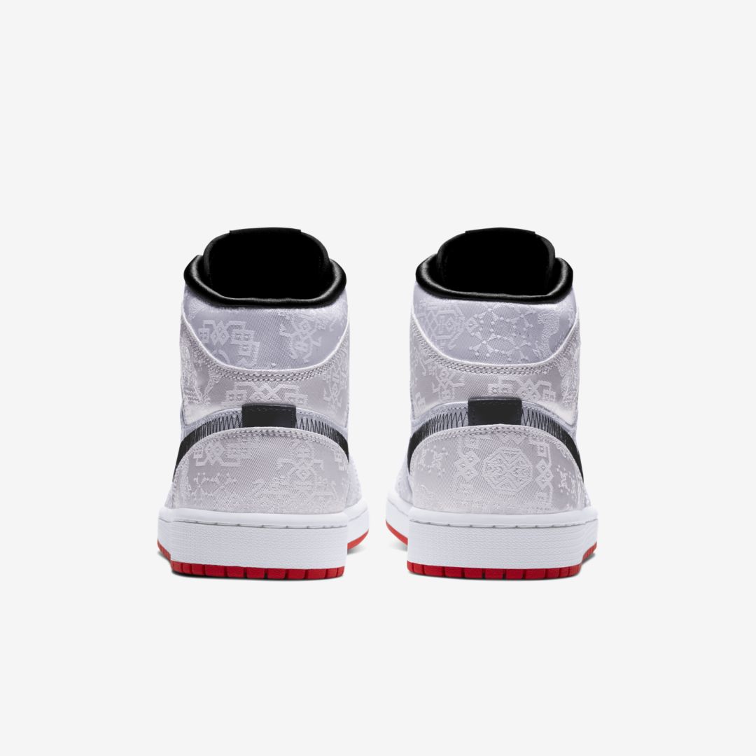 白色丝绸鞋面搭配黑色点缀和红色外底,彰显中国风气质的同时也保留了 Jordan 鞋款经典的黑、白、红的主色调。