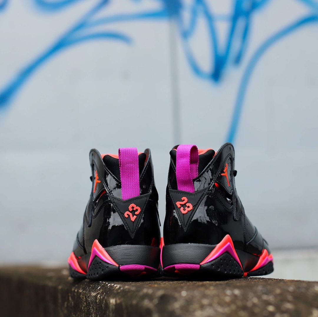 外底部分使用 Air Jordan 7 一贯的色块拼接设计,使用在鞋面出现的橙、紫、黑、黄这几个色调呈现极具艺术观感的视觉效果。