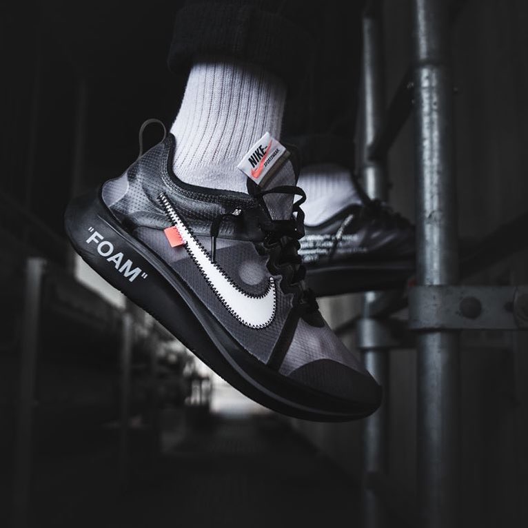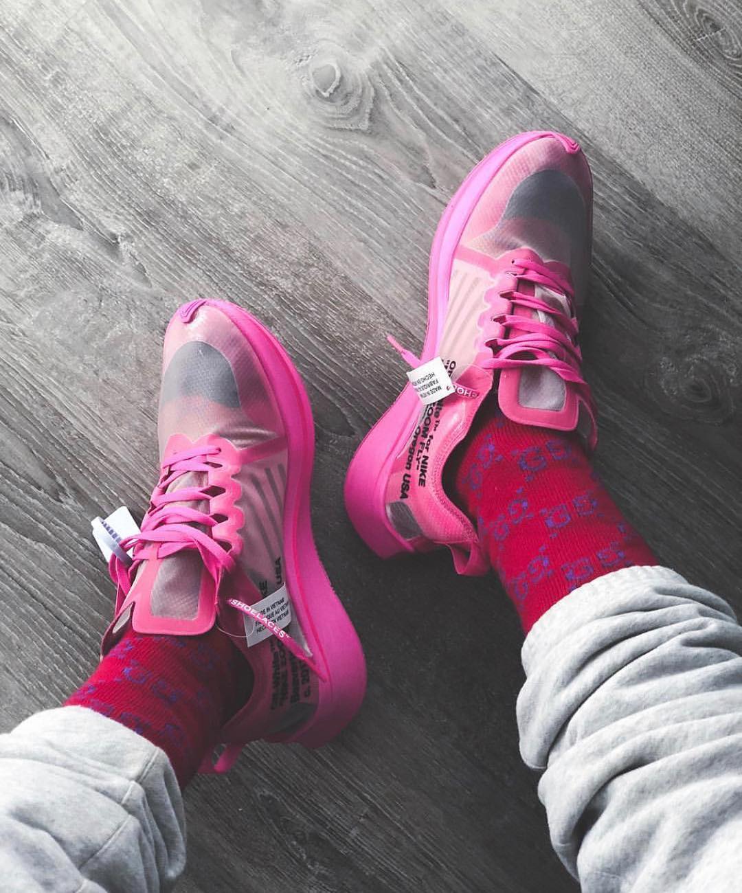 全粉装扮搭配蝉翼鞋面,这双 Zoom Fly 堪称目前 OFF-WHITE x Nike 系列中最骚的一双。