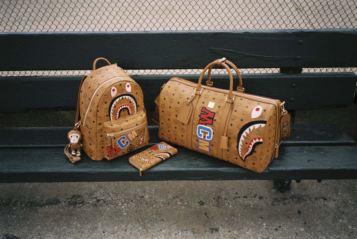 配饰包括双肩背包、旅行包、长 / 短款钱包等 MCM 标志性的单品,基于 MCM 传统的设计和制作工艺,巧妙地融入 BAPE® 经典「鲨鱼 / 老虎 / WGM」组图、迷彩、猿人头等图案。
