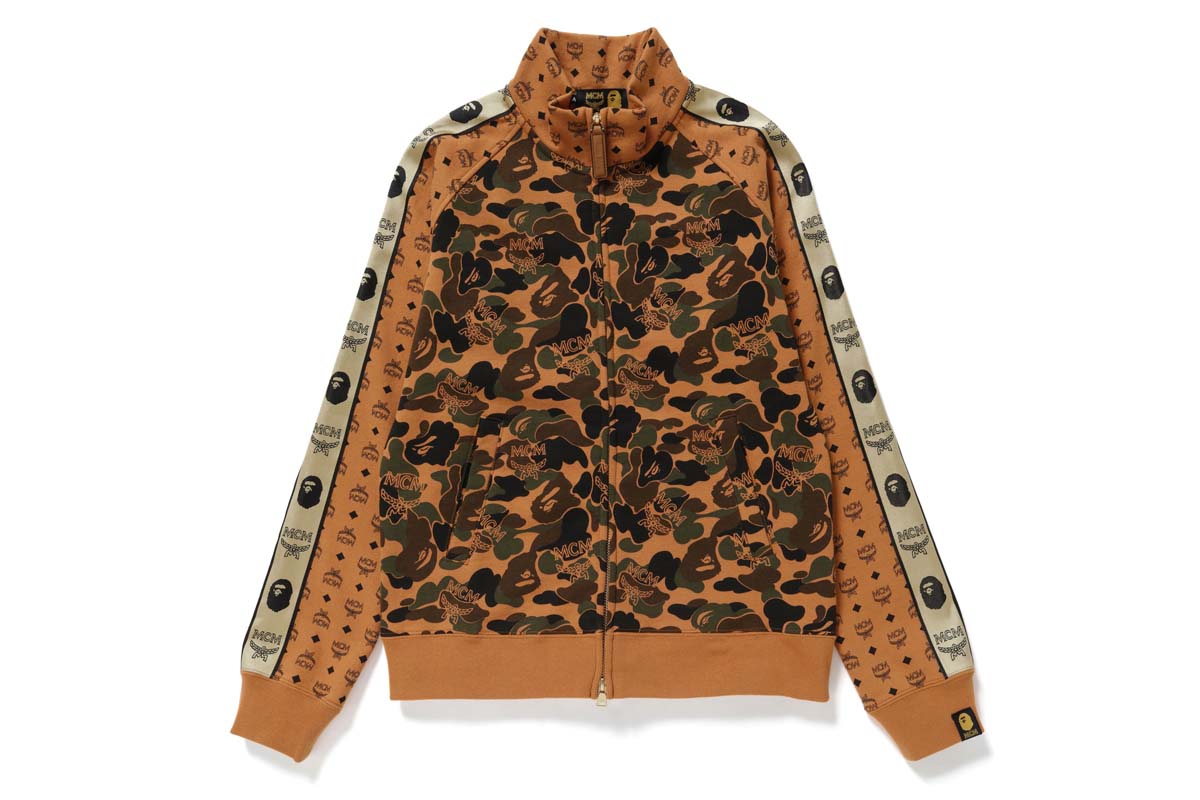 联名服装包括运动夹克、连帽卫衣、裤子、卫衣、短 TEE 和拖鞋单品,以 MCM 惯用的深卡其色和经典 Visetos 印花设计为基调,装饰 BAPE® 经典的迷彩印花。