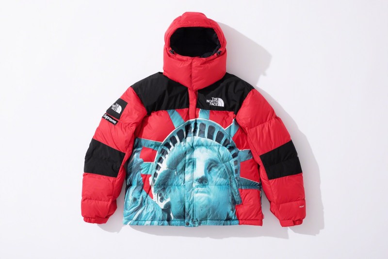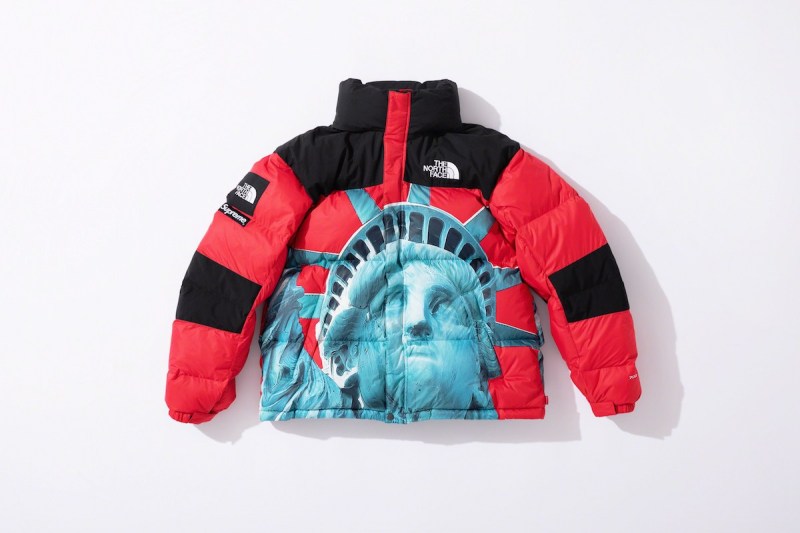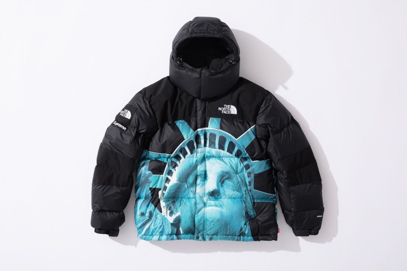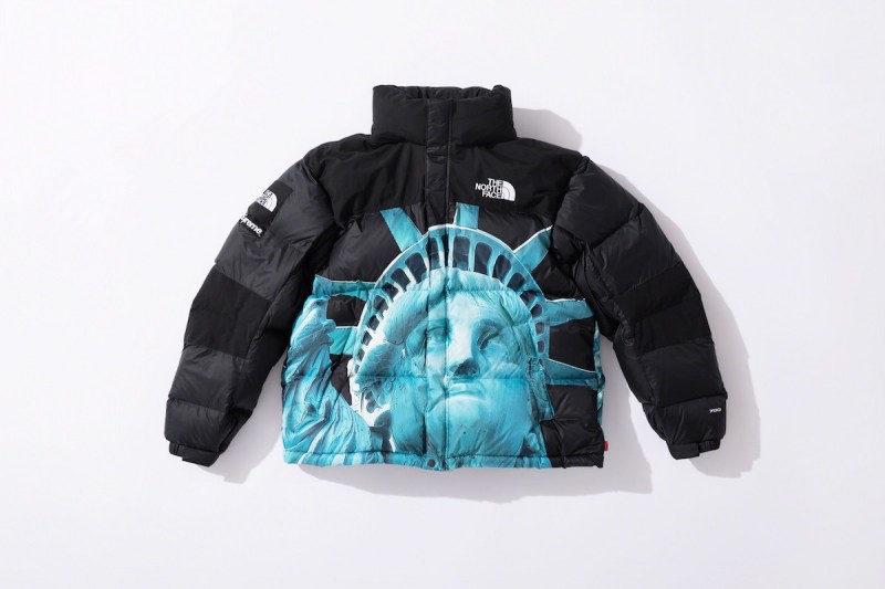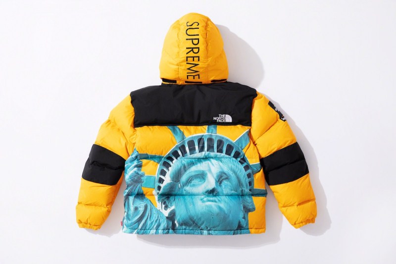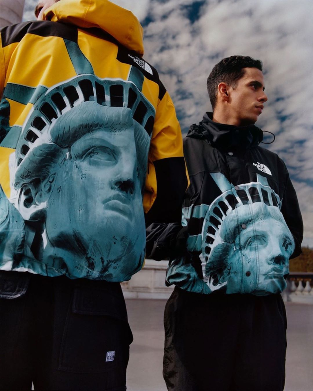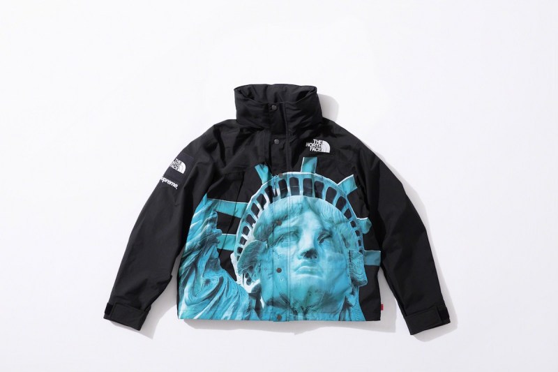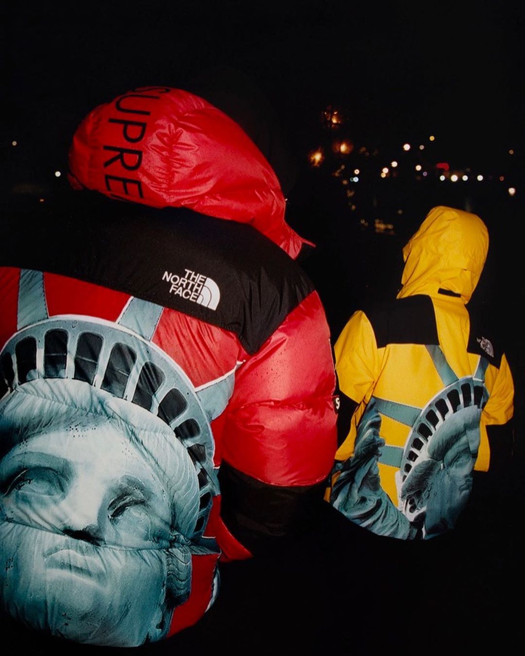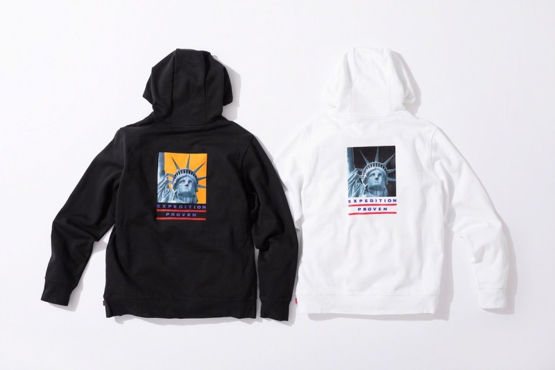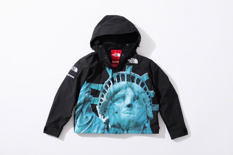 此次的短袖与卫衣款式同此前的设计风格一致,正面是简洁的 Supreme 与 The North Face 字样,背面则是本系列醒目的自由女神像图案。