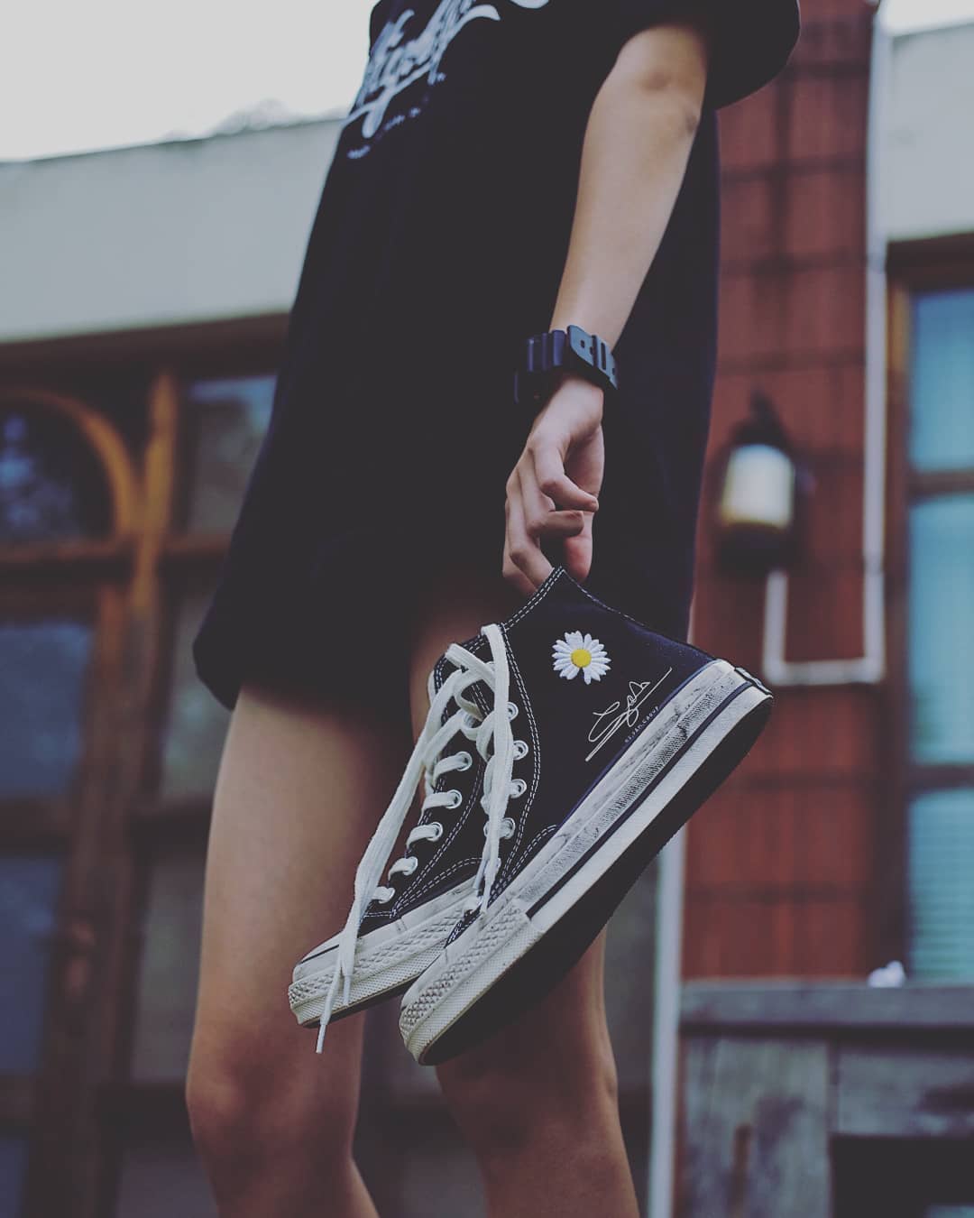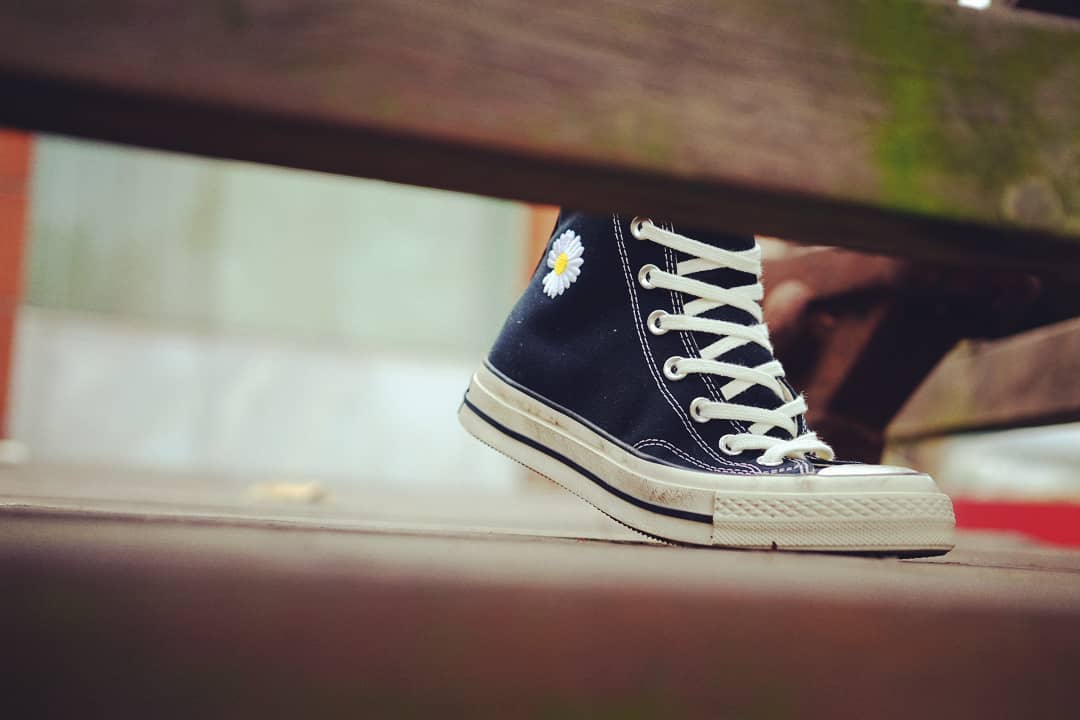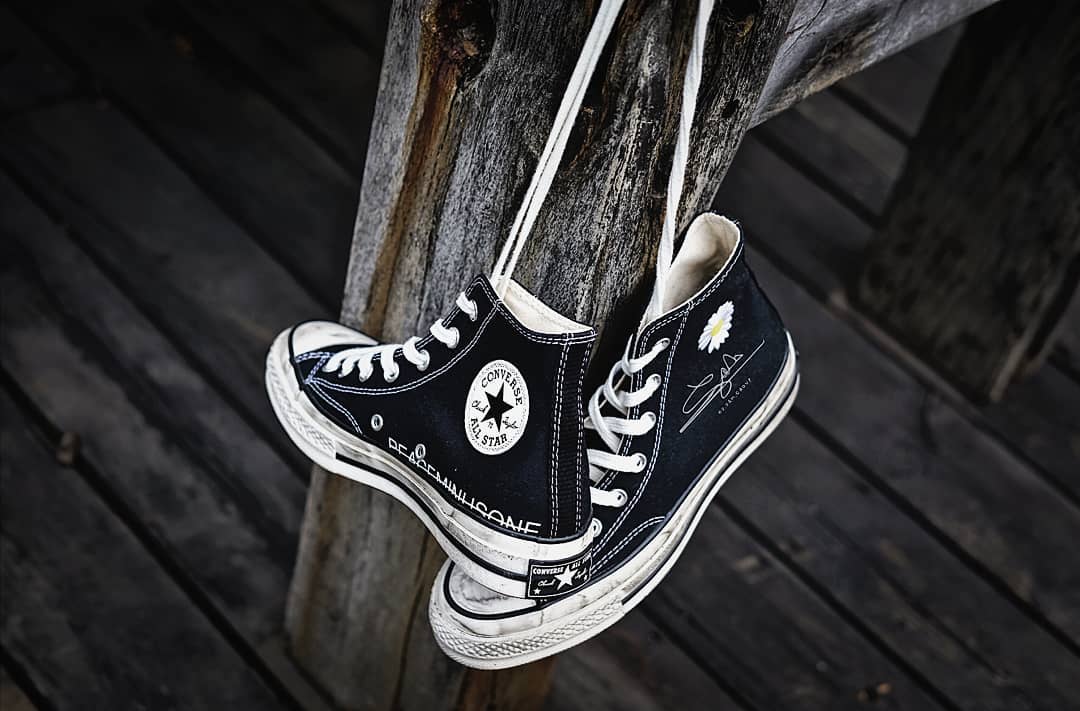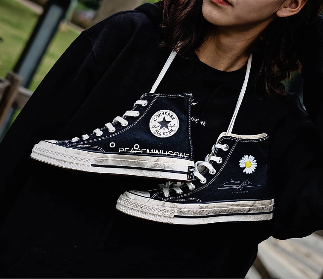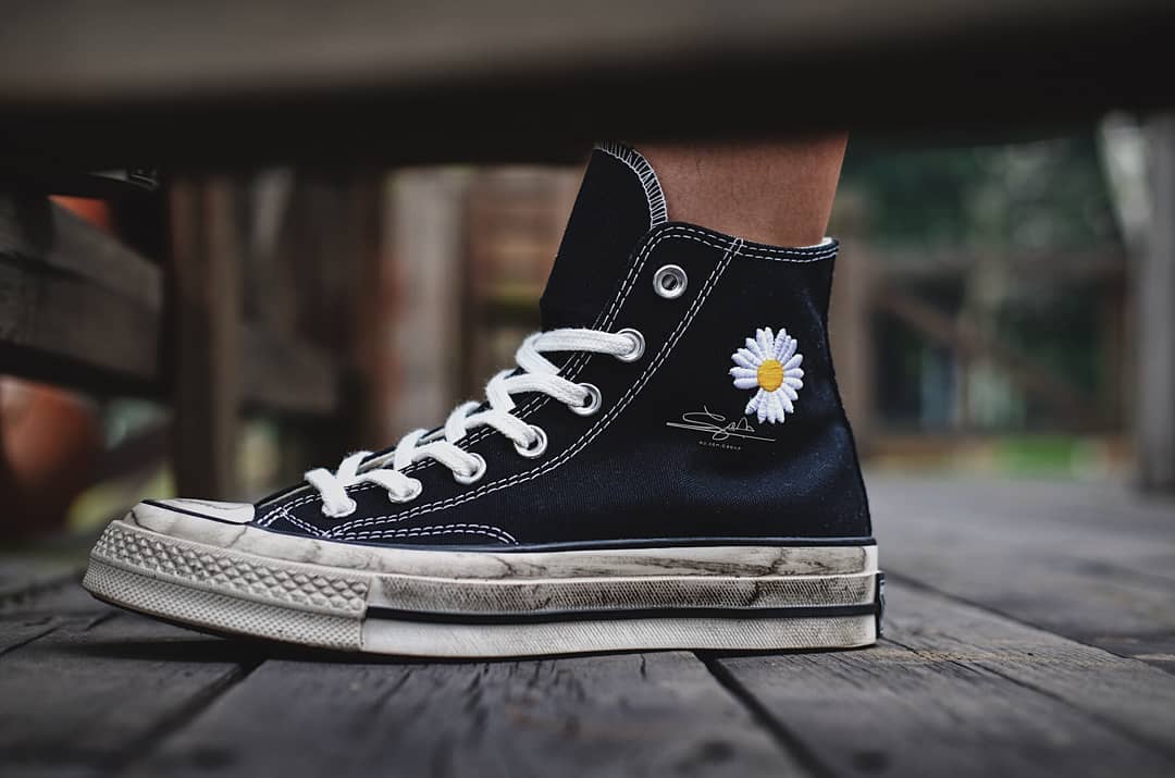 此次以黑色的 Converse Chuck 70 为蓝本,在帆布鞋面上加入了标志性的雏菊刺绣 Logo,质感扎实厚重。