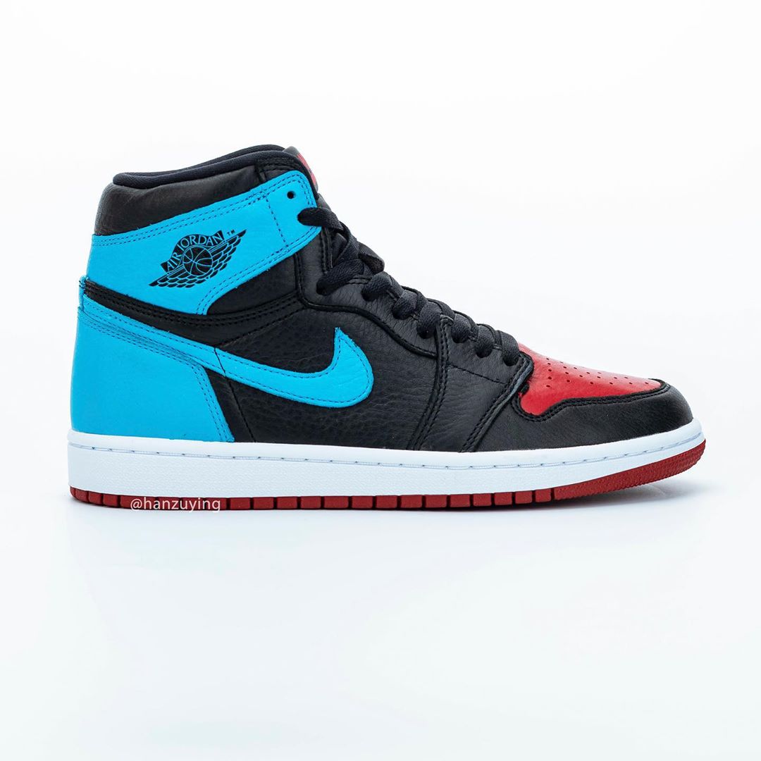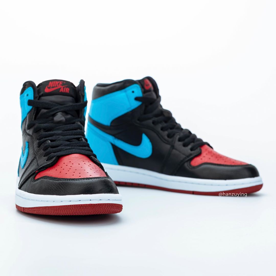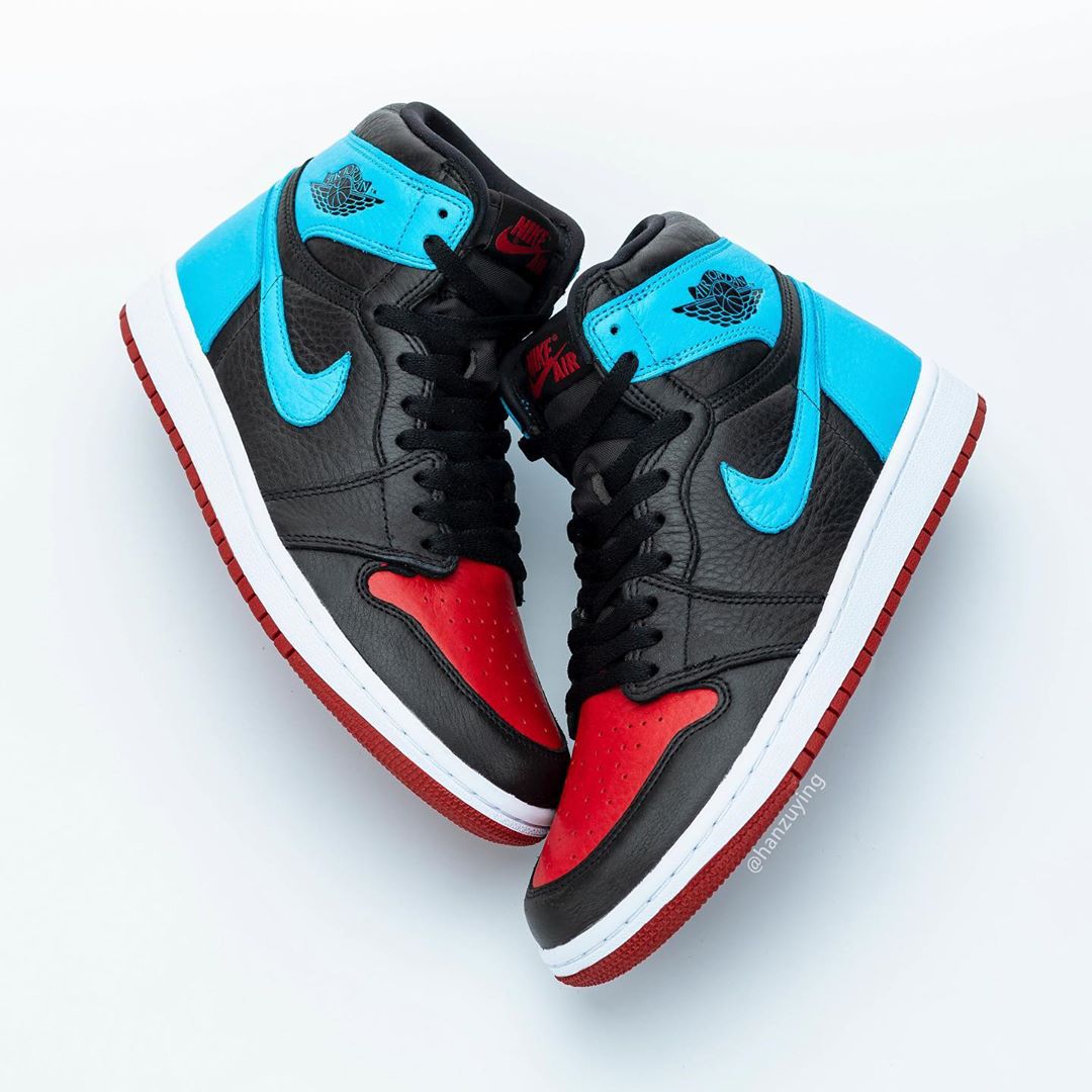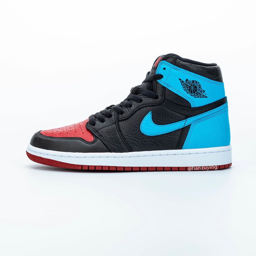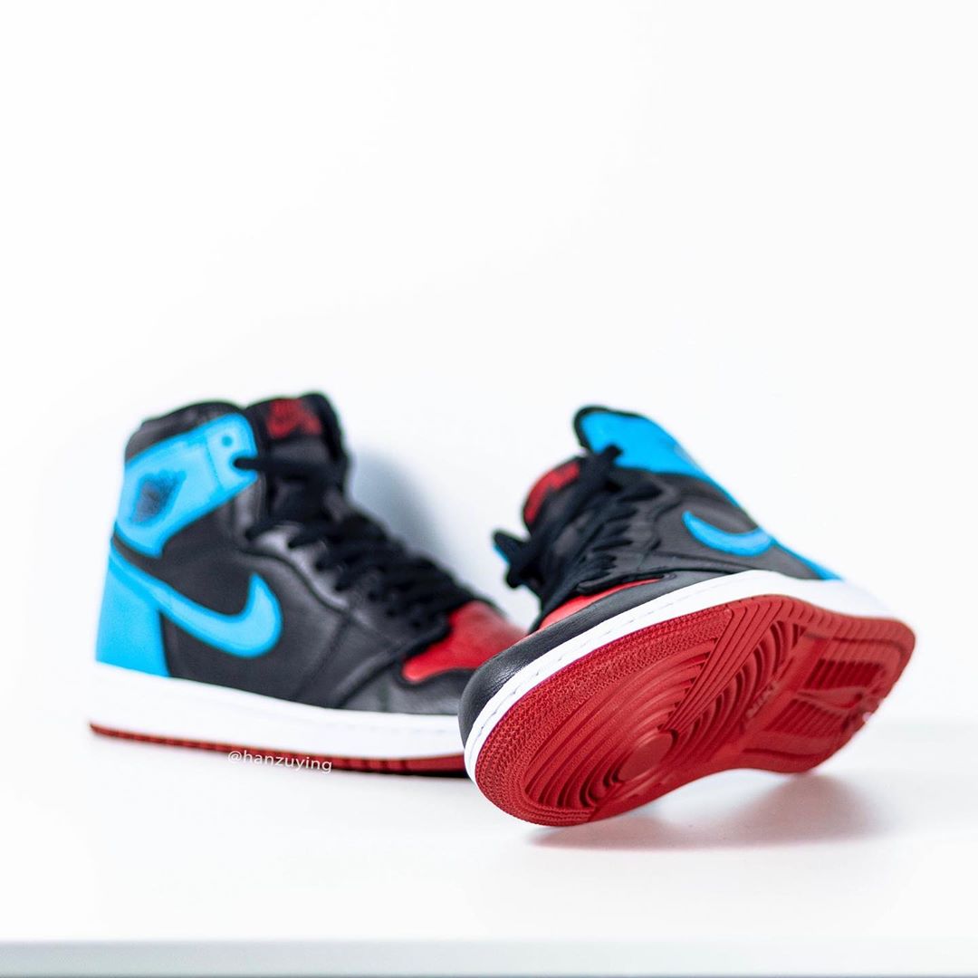设计上将 Air Jordan 1 非常经典的黑红与黑蓝配色合二为一,只是这双鞋的蓝色相比黑蓝要更浅,偏向于同样经典的北卡蓝色。