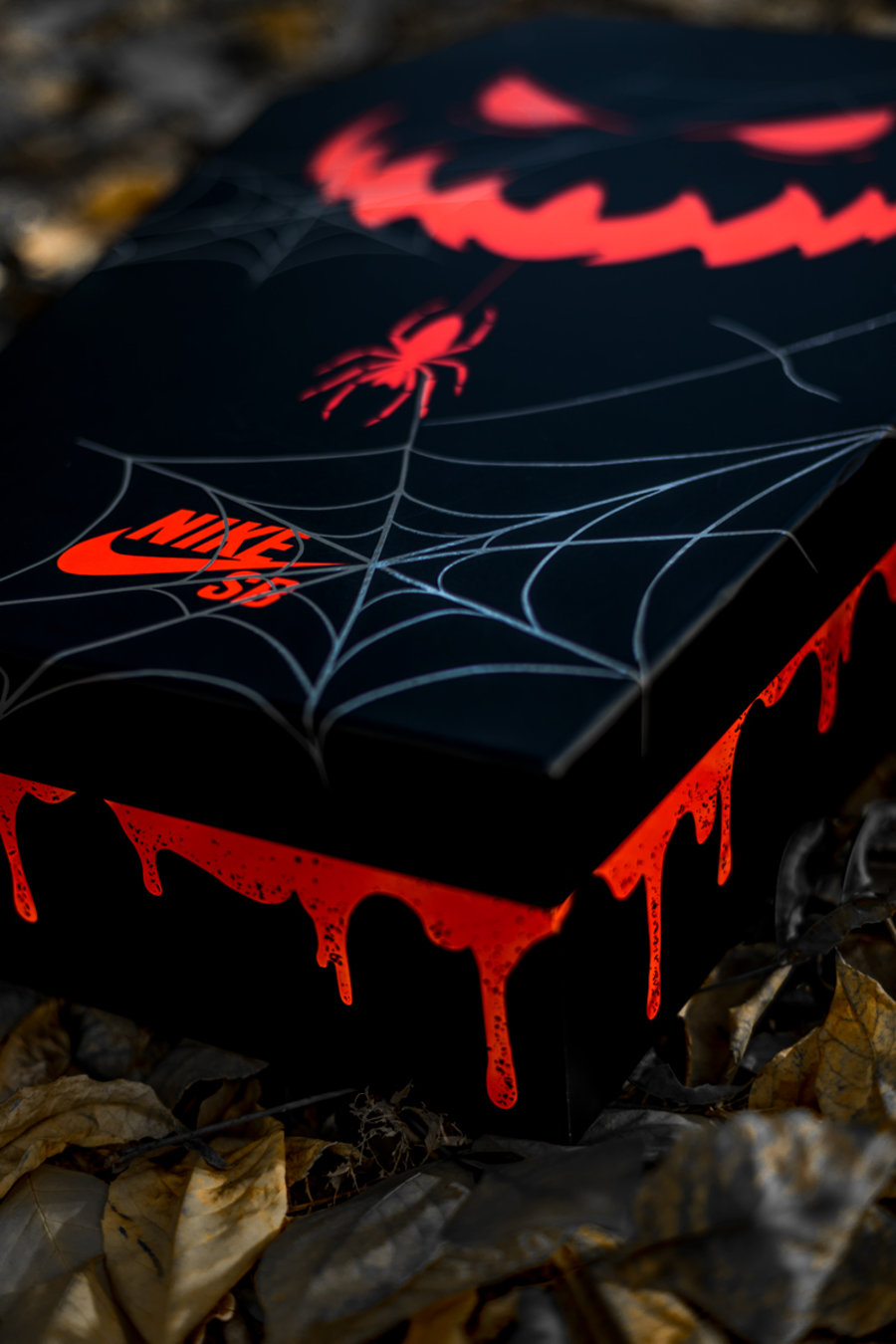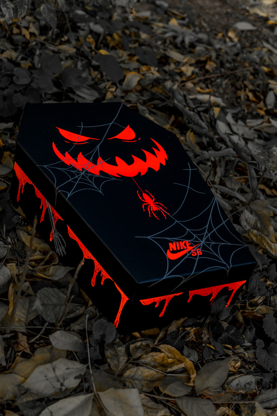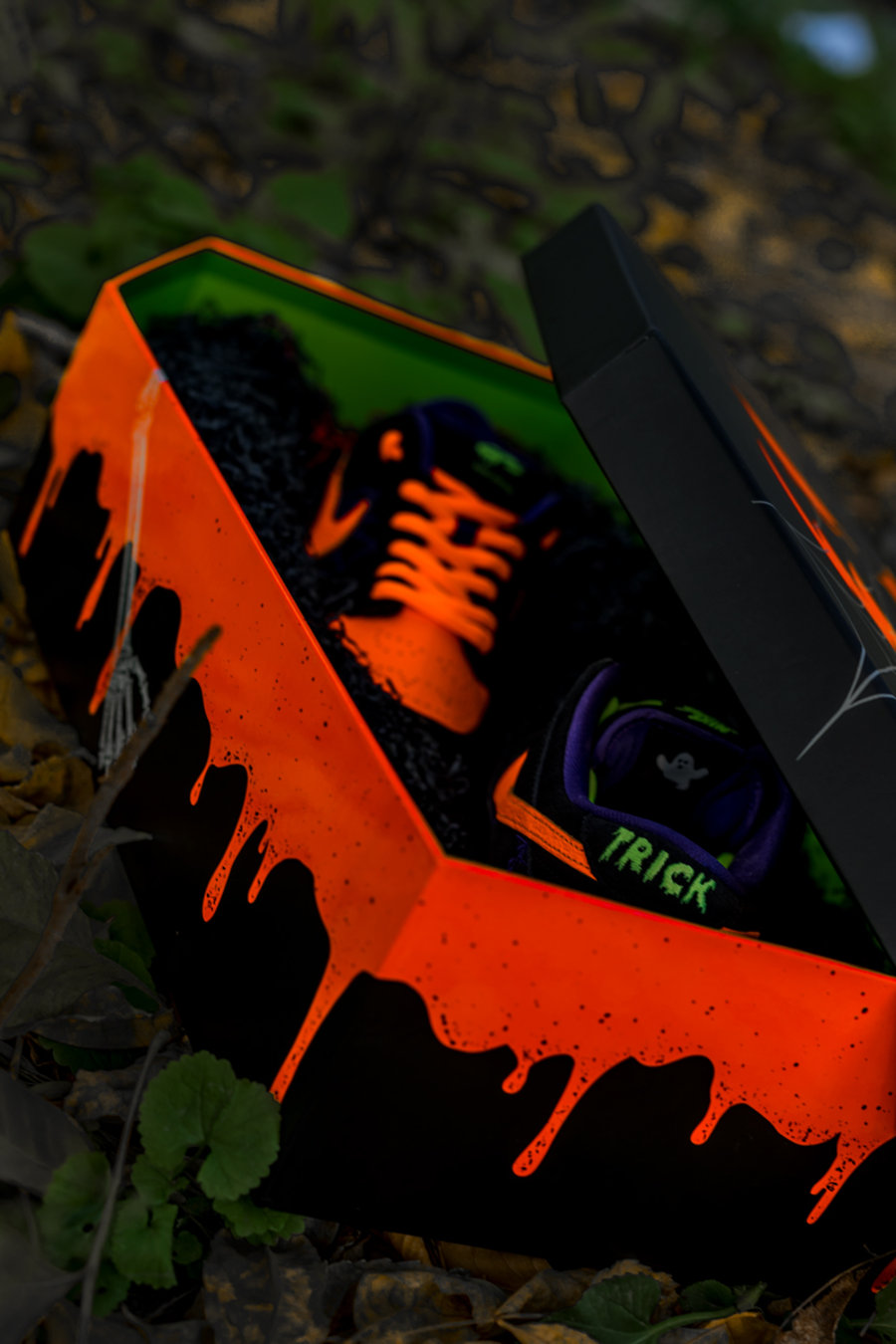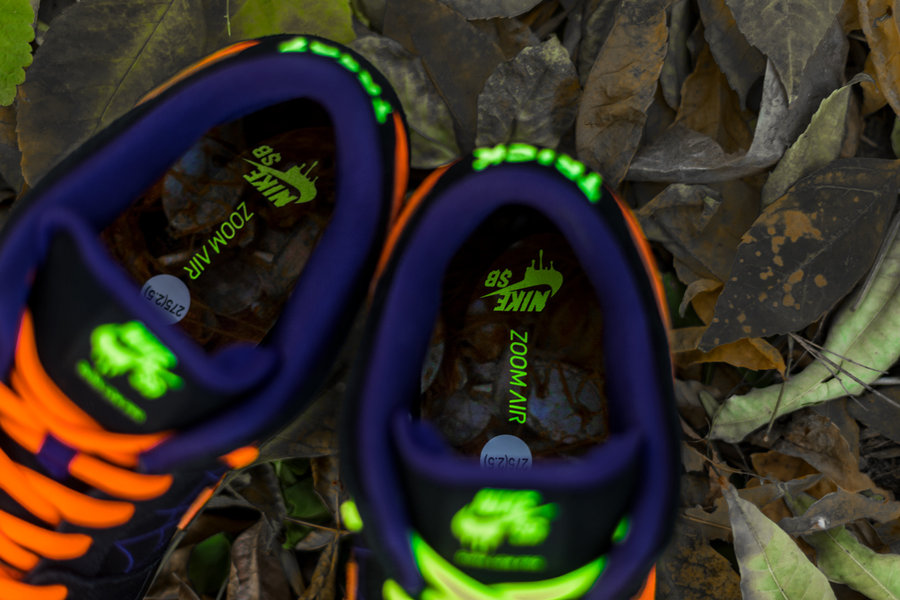 鞋盒里边还铺了一层装饰草,剥开箱底还能看见隐藏的 Nike SB Logo,万圣节氛围打造的十分浓郁。