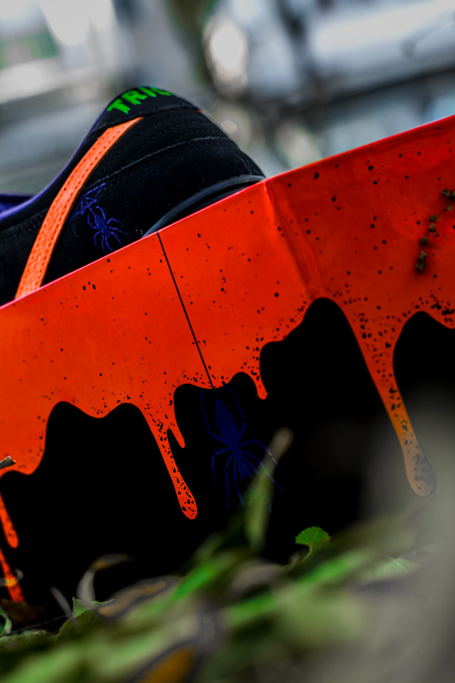 Swoosh Logo 覆盖紫色蜘蛛网,钩子后边还吊着一个小蜘蛛,与鞋盒另一侧的紫色蜘蛛巧妙呼应。