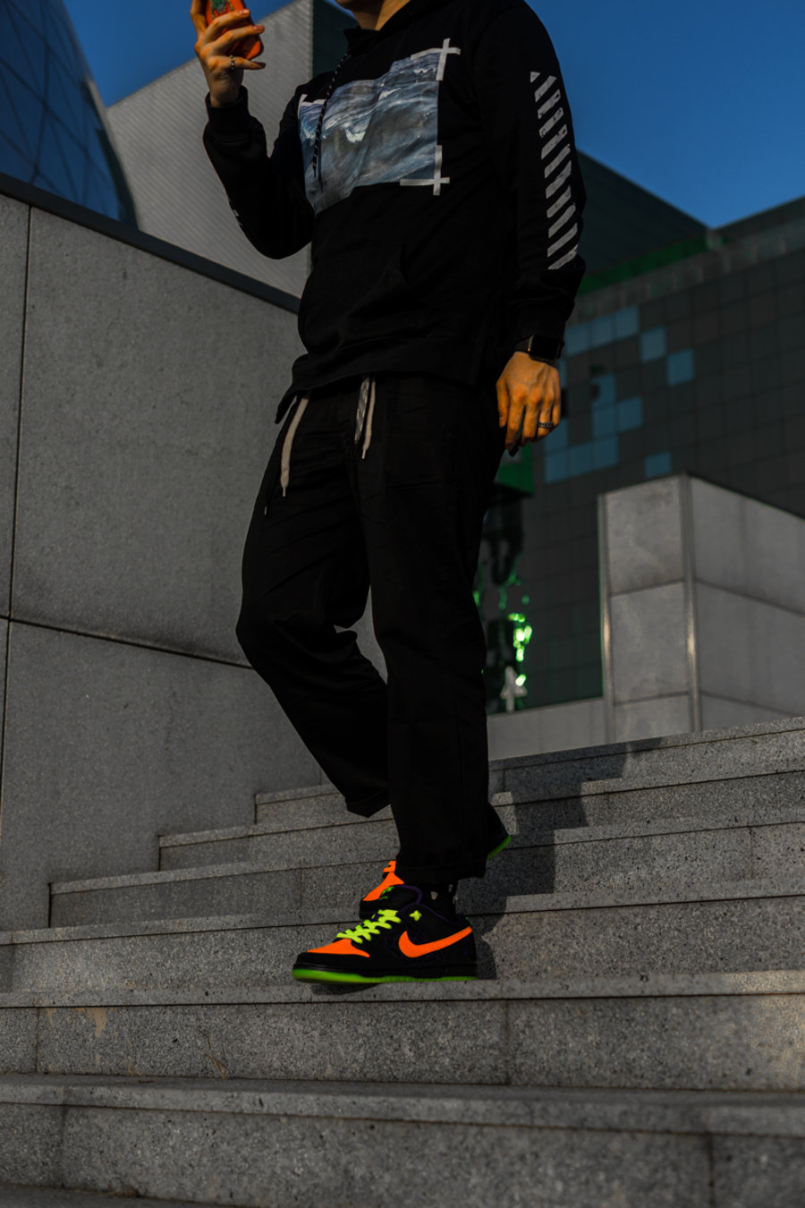 小编顺应鞋面配色,选以黑裤子与黑帽衫搭配。