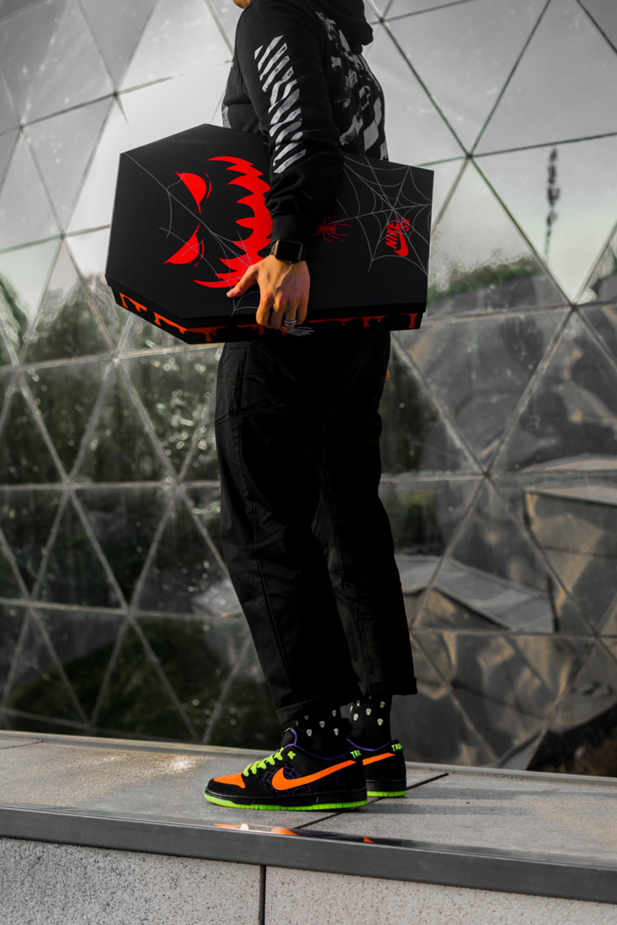 黑色外壳上,带有醒目的橙色南瓜灯鬼脸与蜘蛛造型。鞋盒一侧热固印花的骷髅手,大有几分推棺而出的气势。