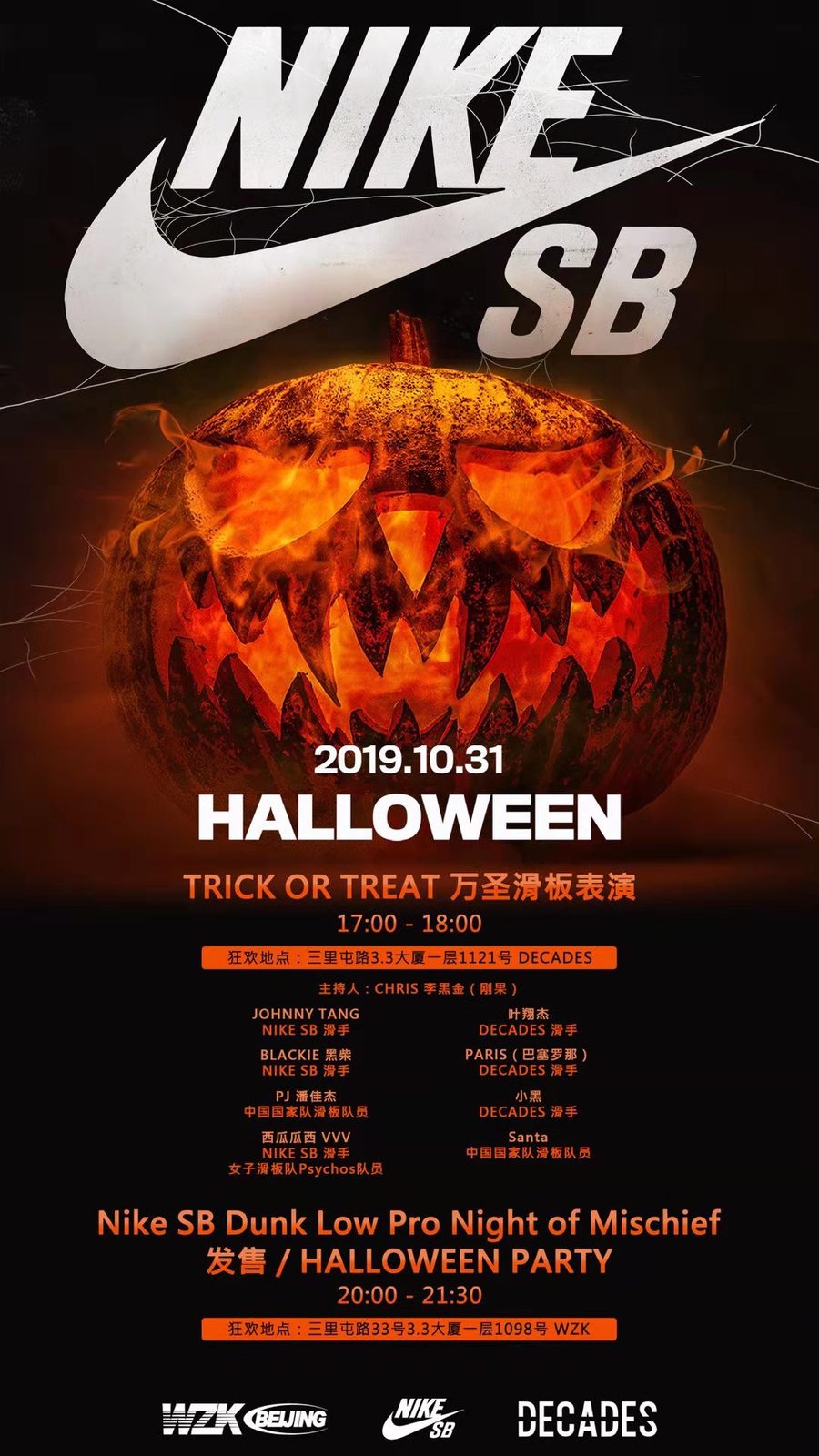除此之外,在 10 月31日 Nike SB 将携手 WZK 北京及 DECADES,在三里屯鞋迷派对活动期间带来精彩的滑板活动。