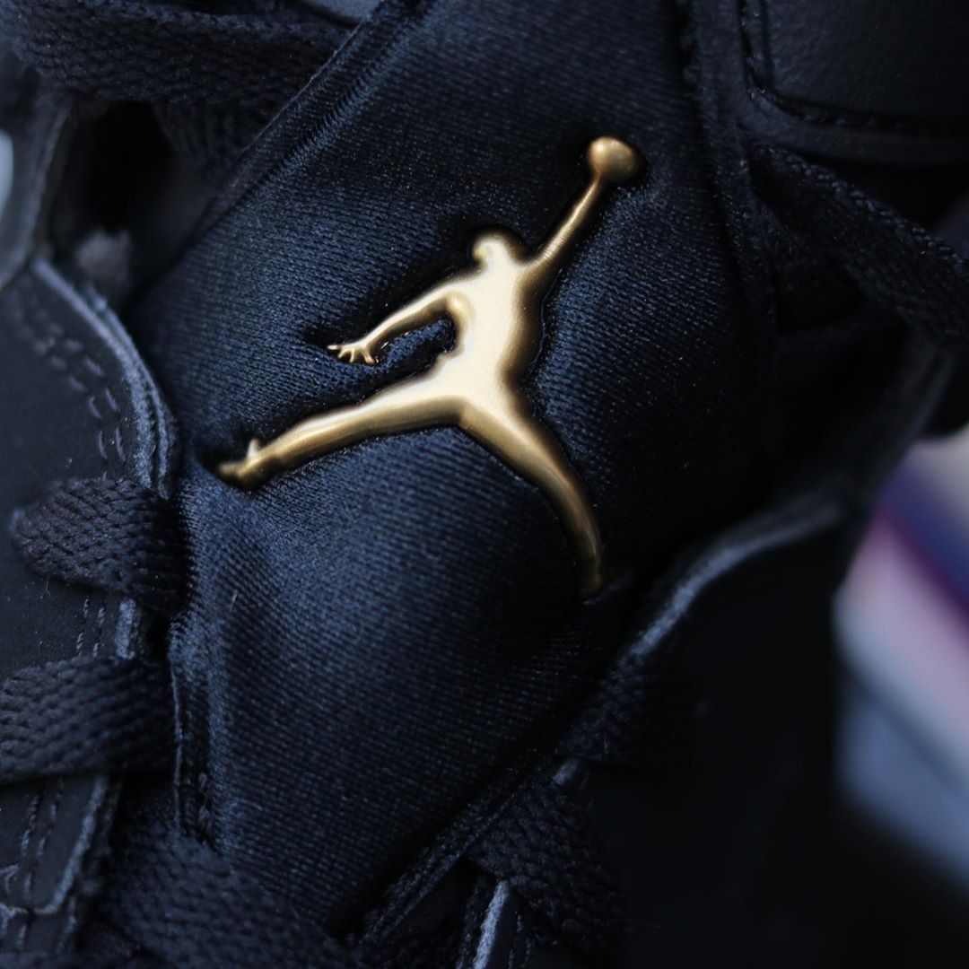 鞋舌 Jumpman Logo 同样以金色浮雕呈现,跟常规 Air Jordan 6 最大不同在于后跟位置飞人标志下方,额外加入金色 23 数字,精致醒目,彰显 DMP 的特殊身份!