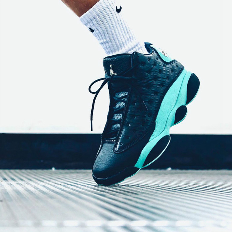 整双鞋以质感高级的黑色鳄鱼纹皮革,搭配 Tiffany 湖水绿色调翻毛材质打造。
