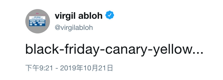 此前 OFF-WHITE 主理人 Virgil Abloh 在个人 Twitter 透露了一则消息:黑色星期五,淡黄色。