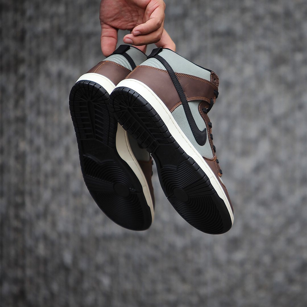 整双鞋以深色为主调,鞋面使用棕色皮革搭配灰色帆布材质打造鞋面,鞋身 Swoosh 与鞋带则为黑色点缀。