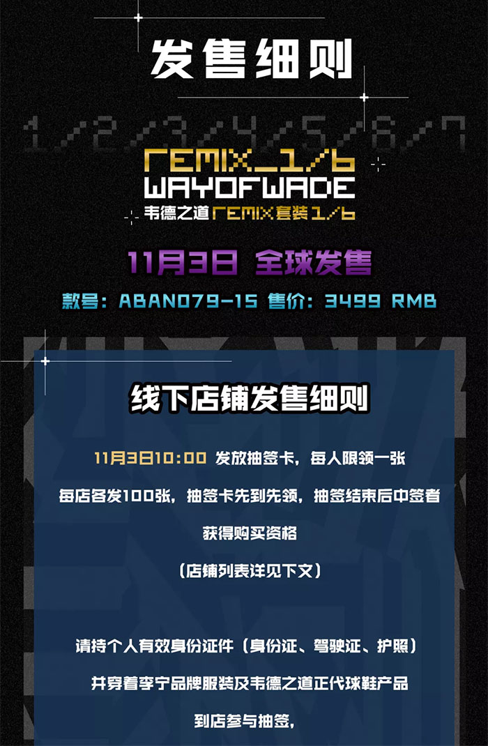 最后为大家带来本次 「韦德之道 Remix 套装 1/6」完整的发售详情,确定将于 11 月 3 日全球范围发售,货号 ABANO79-15,套装定价 ¥3499 RMB!