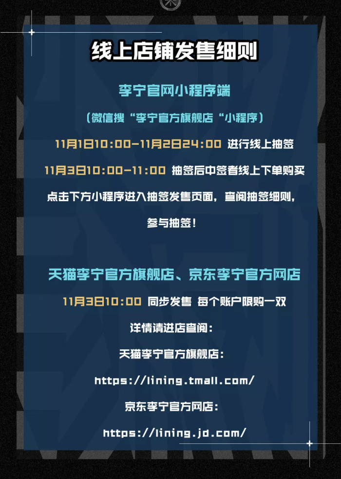 国内将通过线上与线下两种方式发售,除此之外,在 11 月 3 日洛杉矶 ComplexCon 的李宁展台,也将会限量发售!