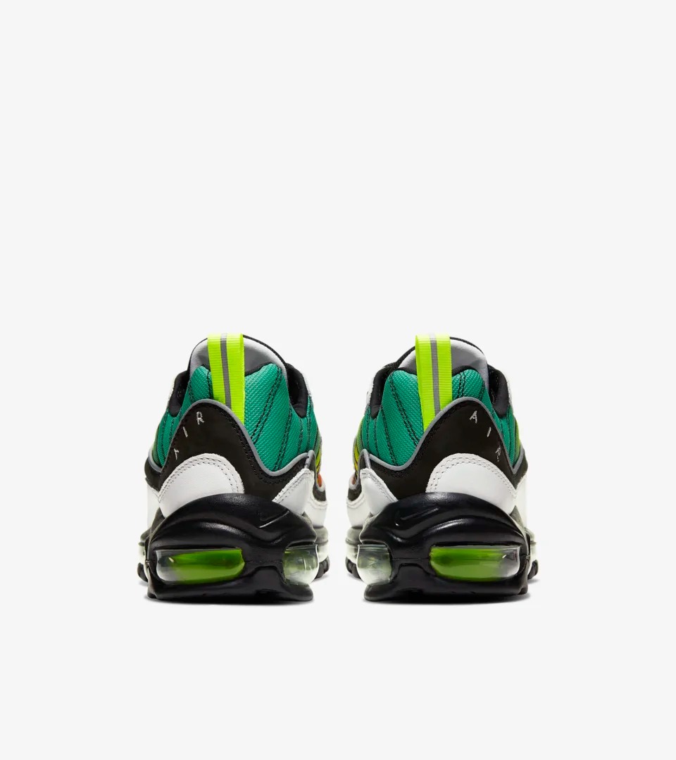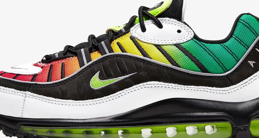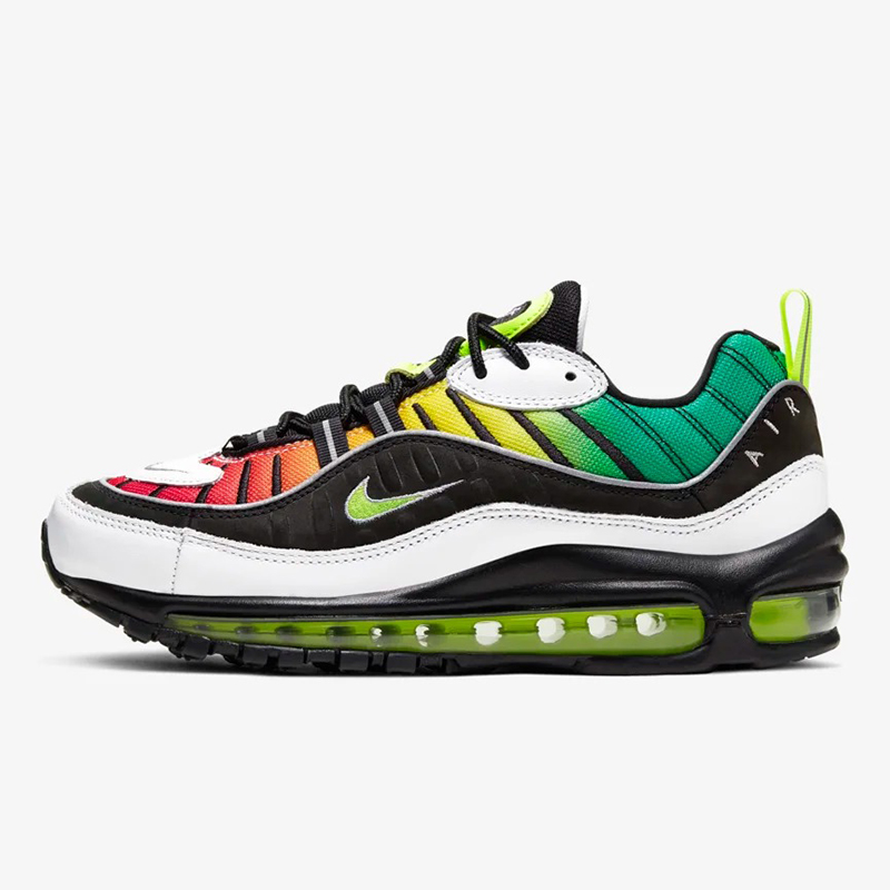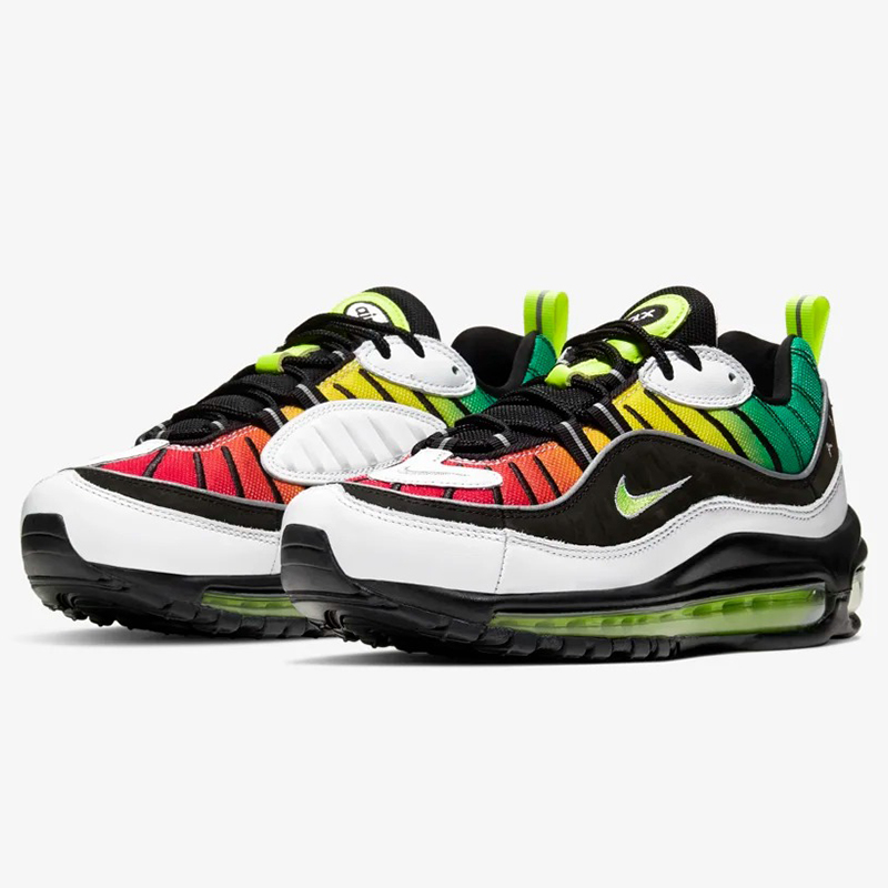 Air Max 98 NXN 的设计灵感源自 90 年代特有的牙买加雷鬼风格,由冷到暖的亮色渐变过度,从鞋头蔓延至后跟。
