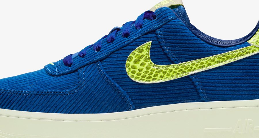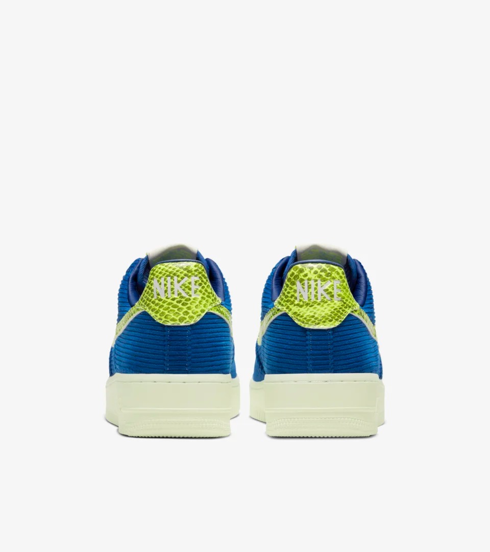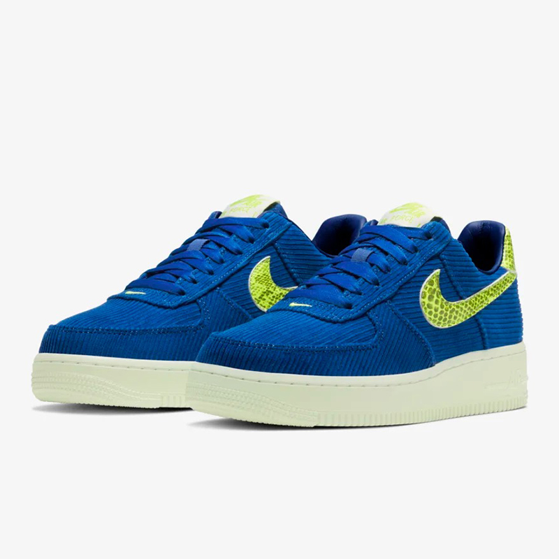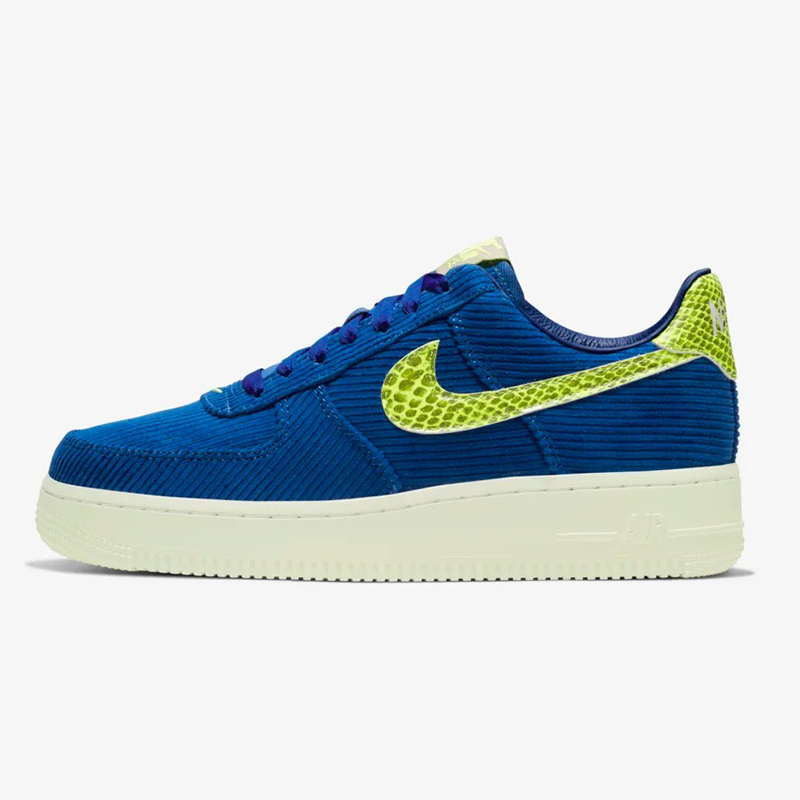 Air Force 1‘07 NXN 采用蓝色灯芯绒与荧光蛇纹 Swoosh Logo,后跟以相同质地的蛇纹皮革收尾,搭配夜光材质中底、外底。“自带光源”的这双鞋,称得上是双吸睛神器!。