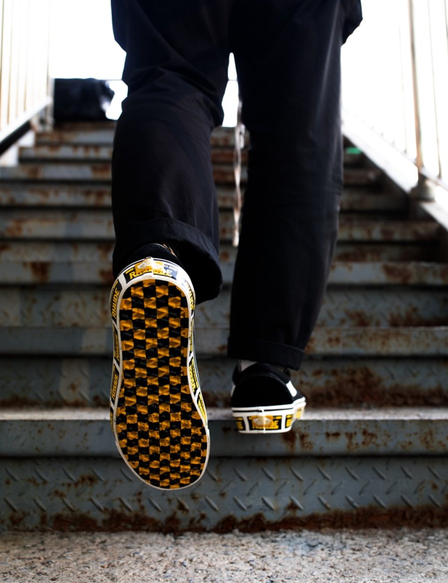 后跟标也采用黄色设计与之相呼应,鞋底也颇为走心的以撞色棋盘格形式呈现。